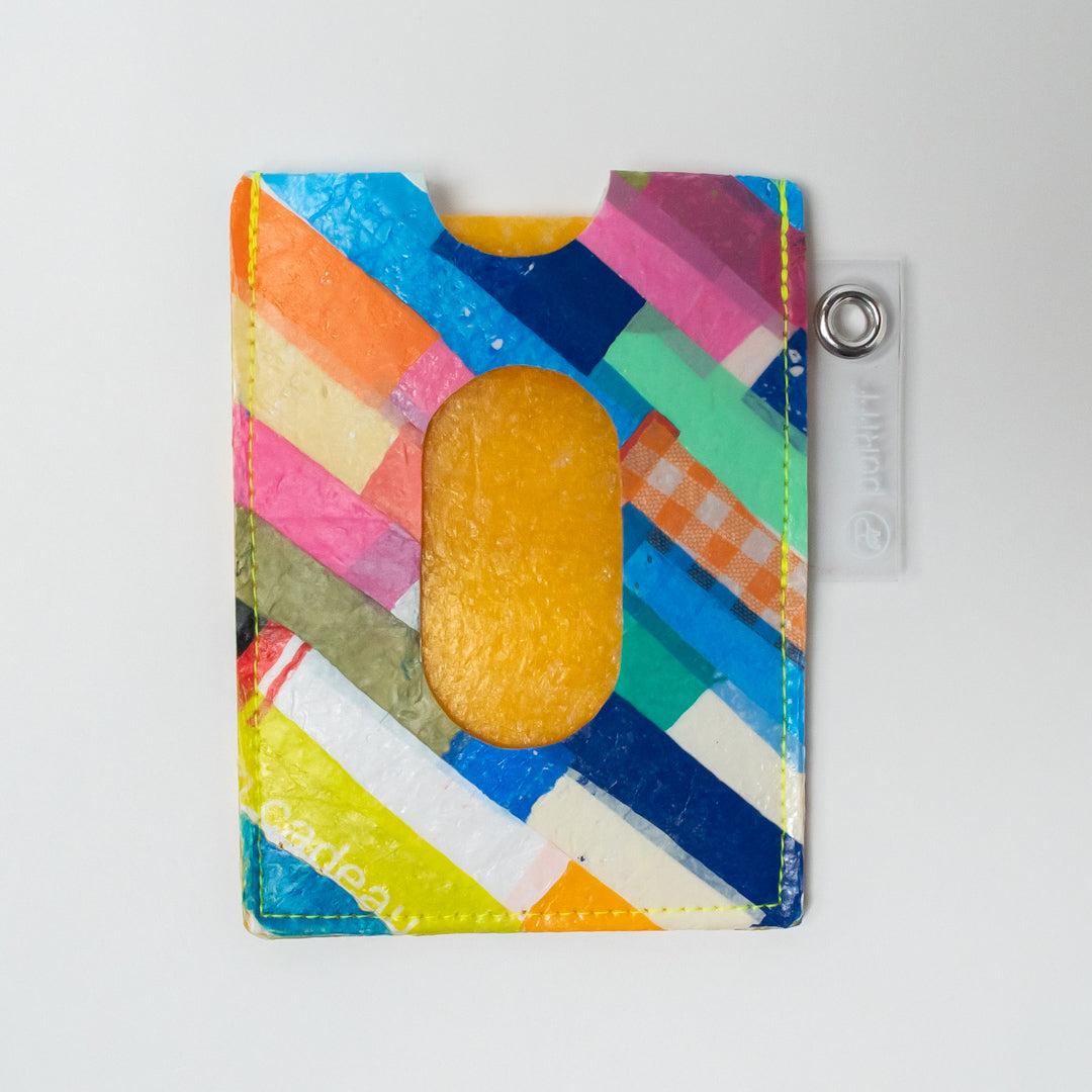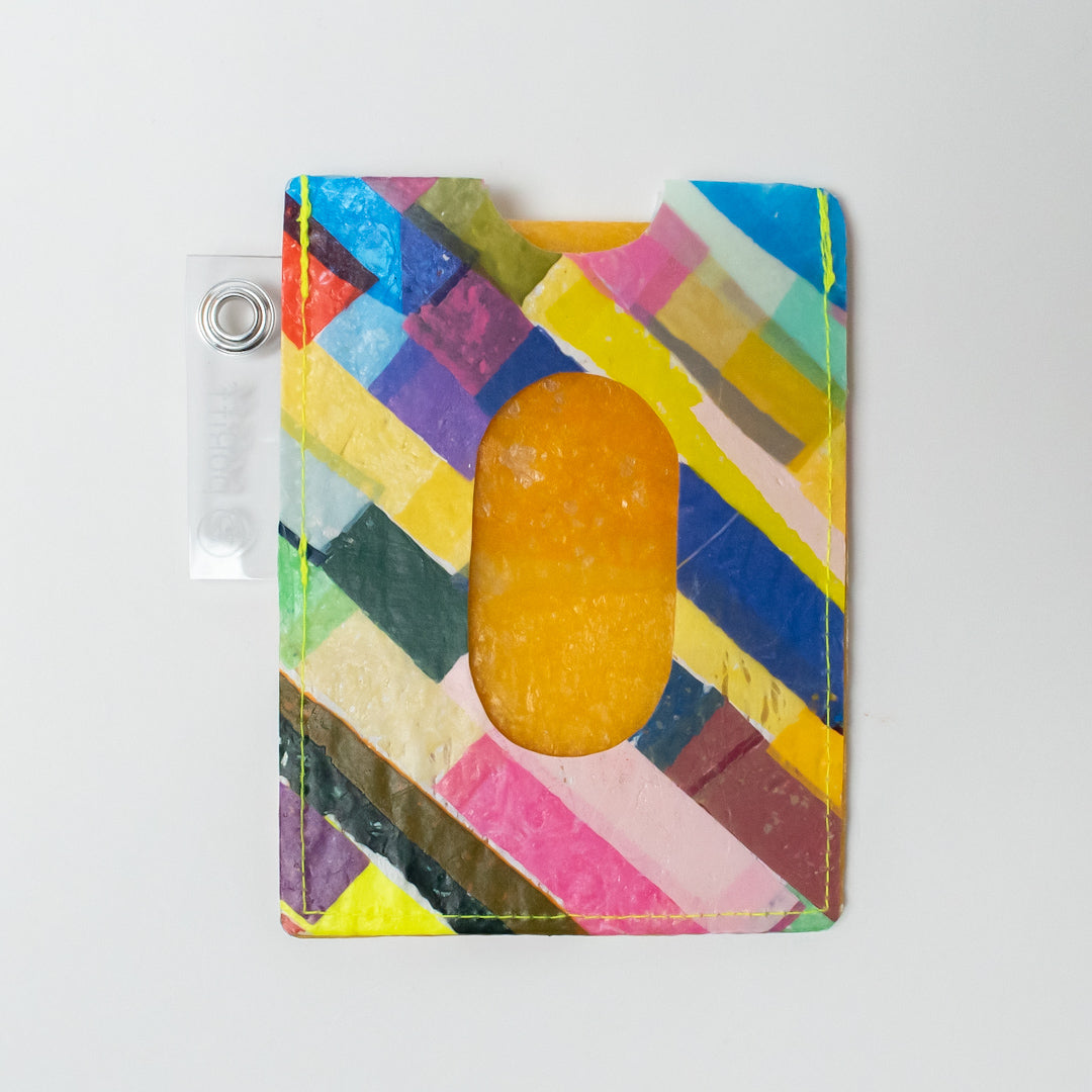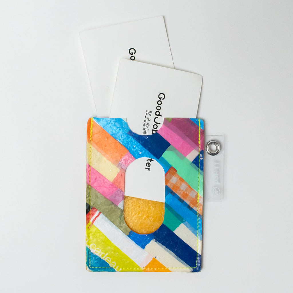 カラフルな柄のパスケースです。ひとつひとつ柄が違うので、お好きなモノを選んでください。裏、表にカードを入れられるので、2枚収納できます。