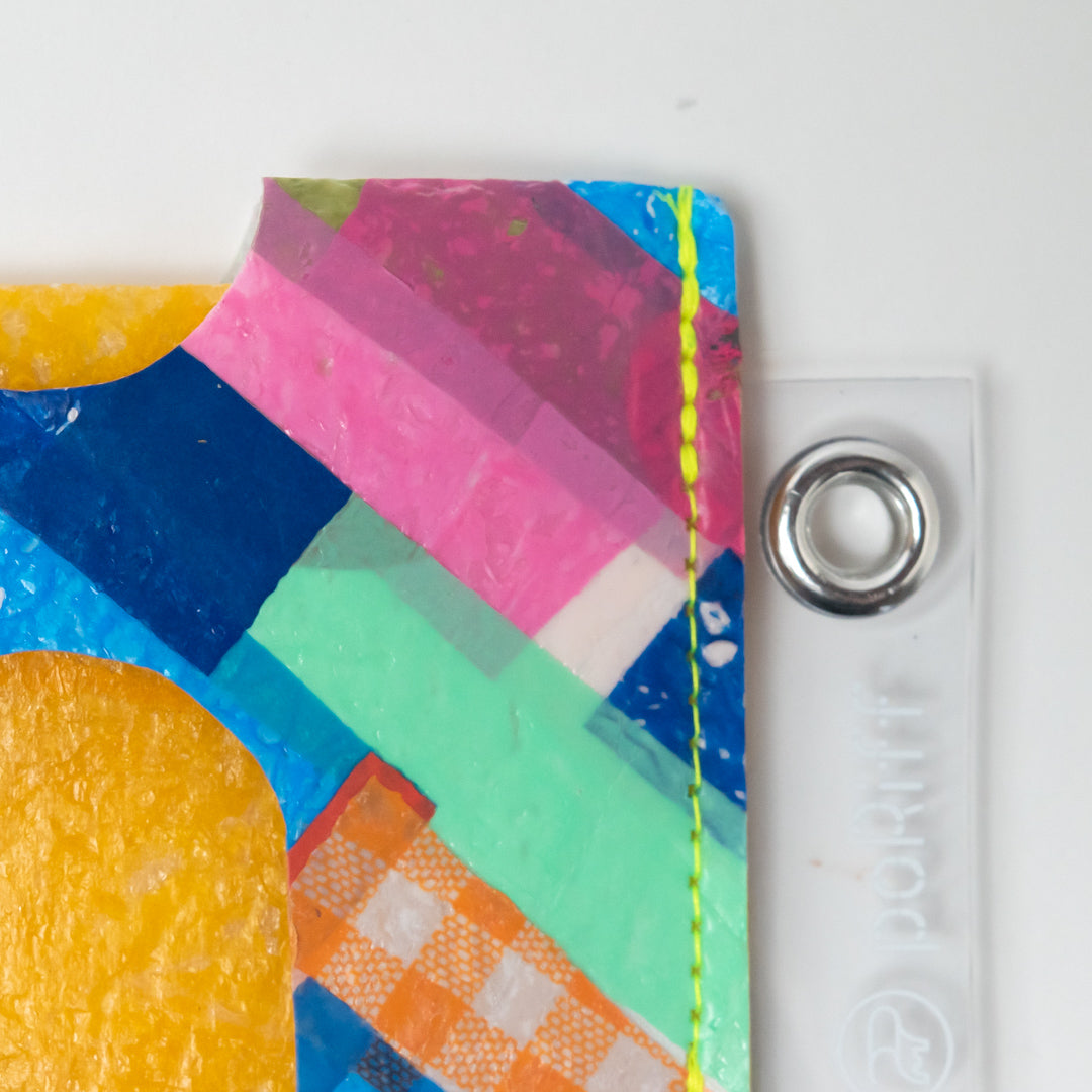 一見捨ててしまうような買い物袋たちをコラージュし、熱で圧着して完成するシートを使用してプロダクトに変えています。