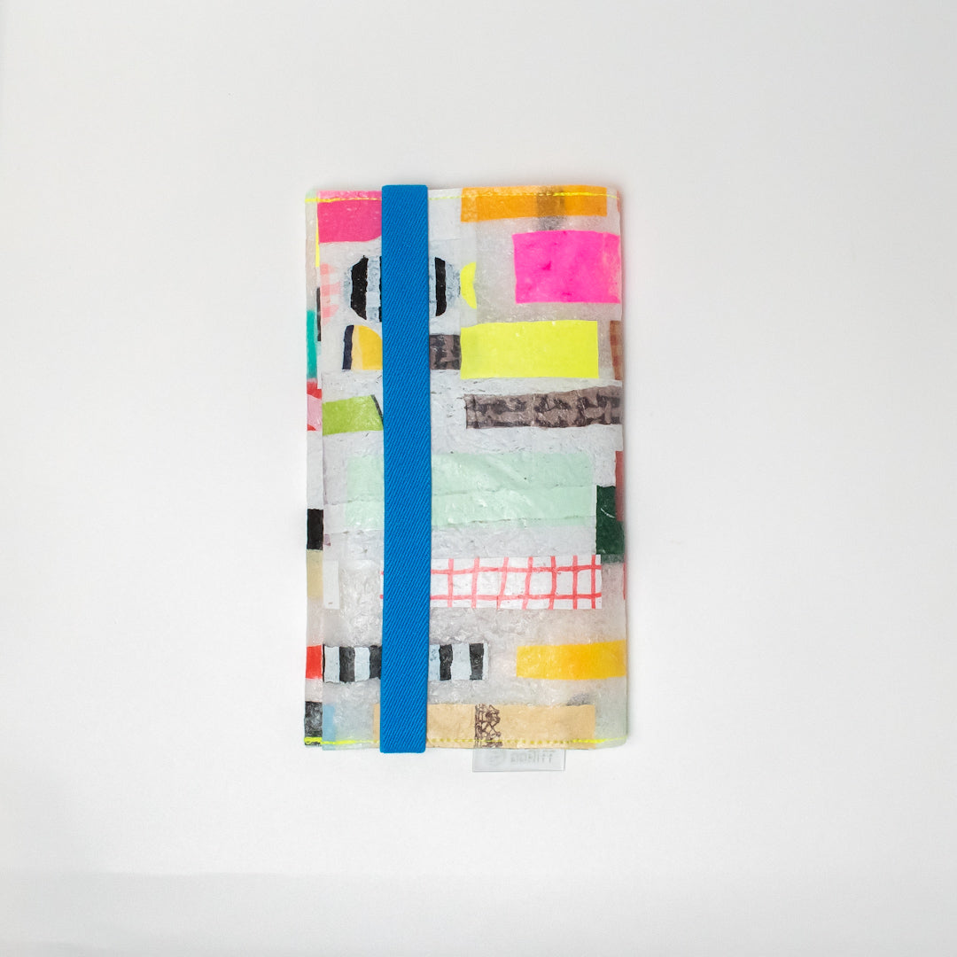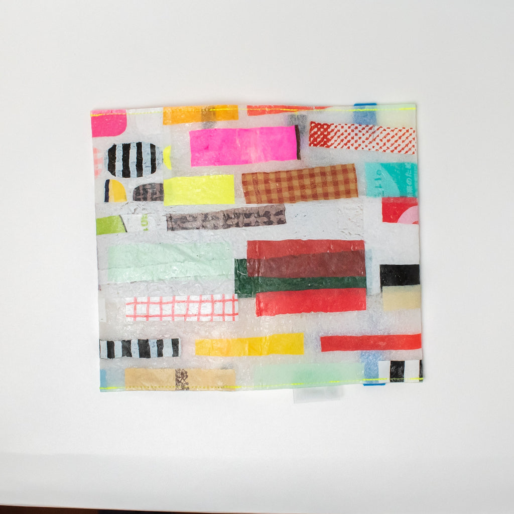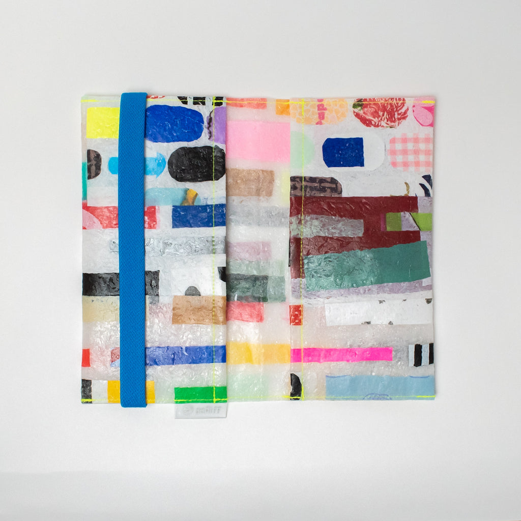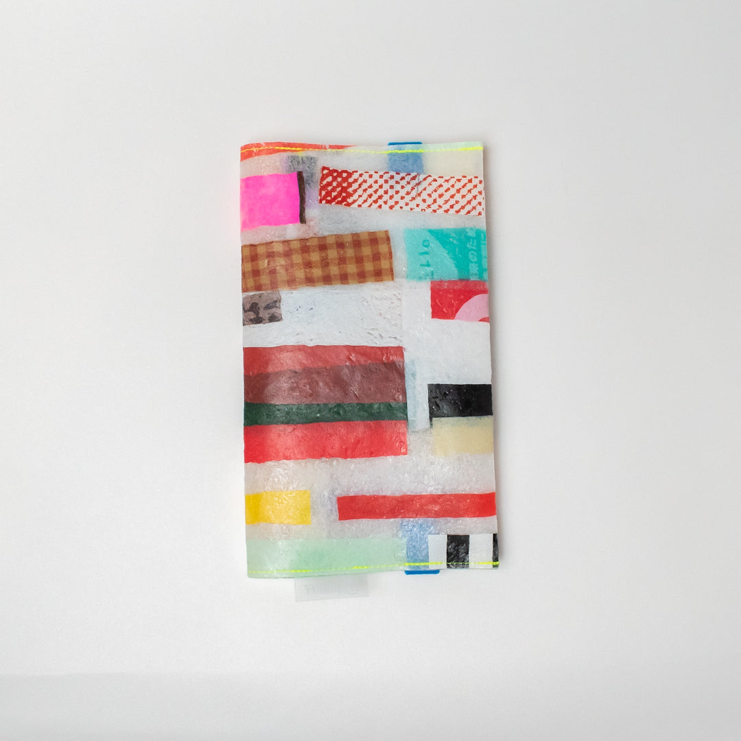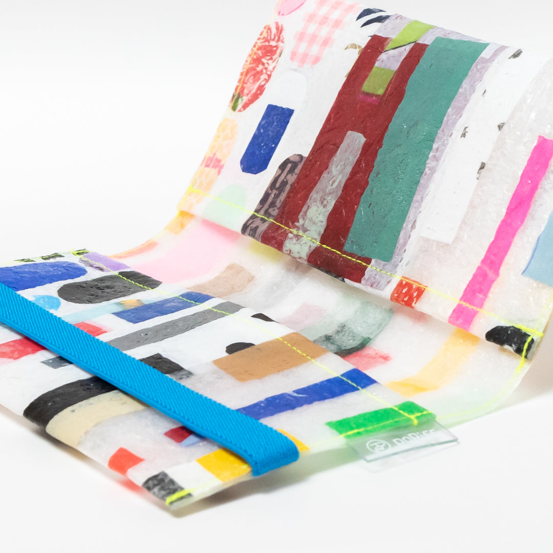 一見捨ててしまうような買い物袋たちをコラージュし、熱で圧着して完成するシートを使用してプロダクトに変えています。