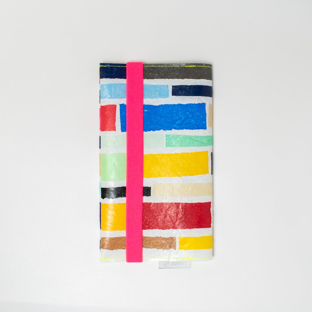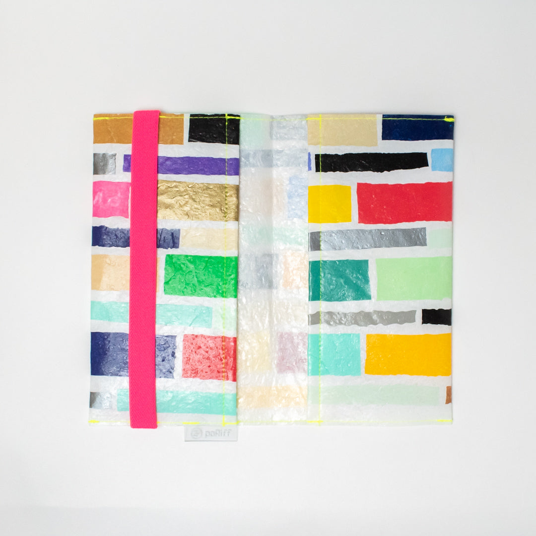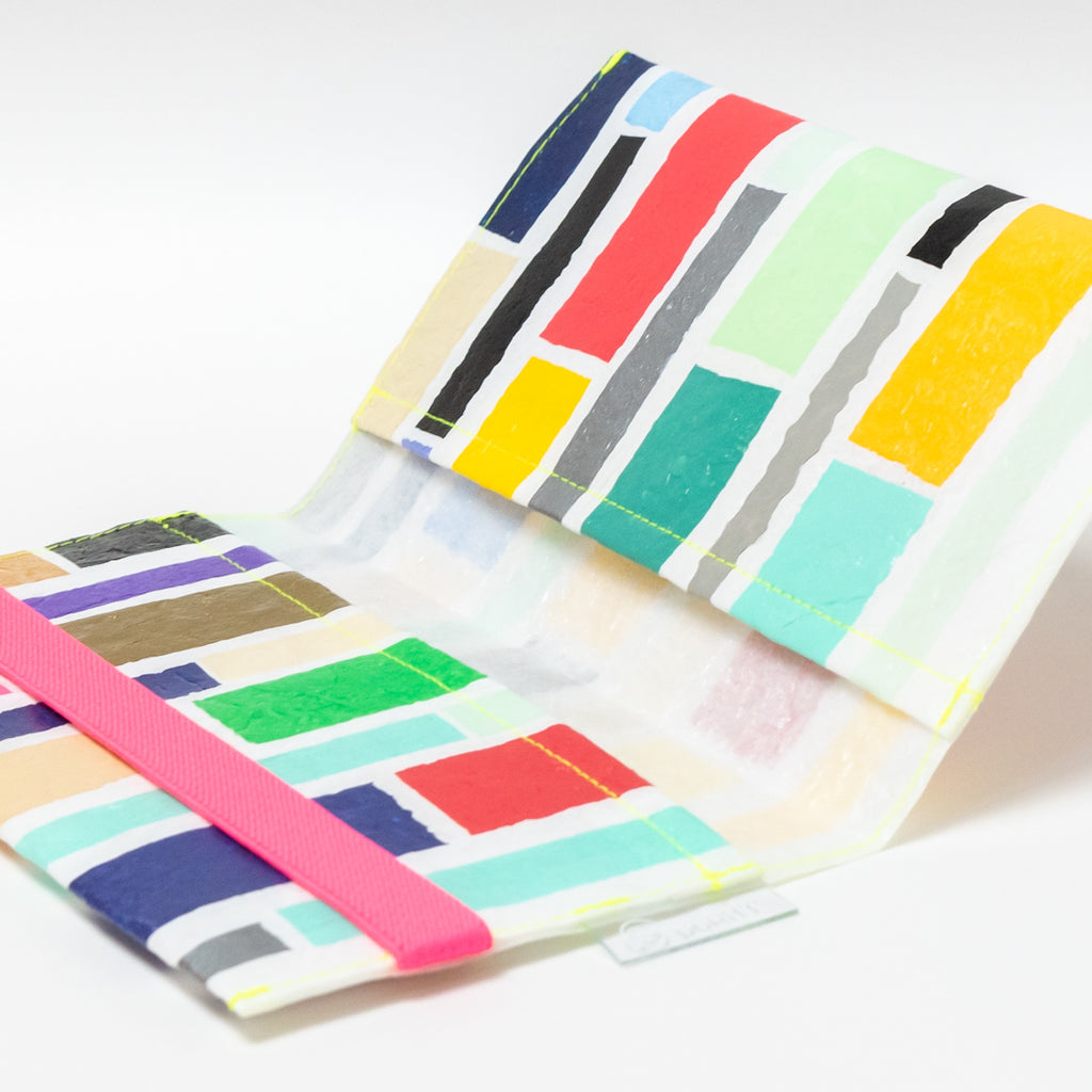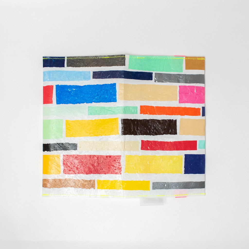一見捨ててしまうような買い物袋たちをコラージュし、熱で圧着して完成するシートを使用してプロダクトに変えています。