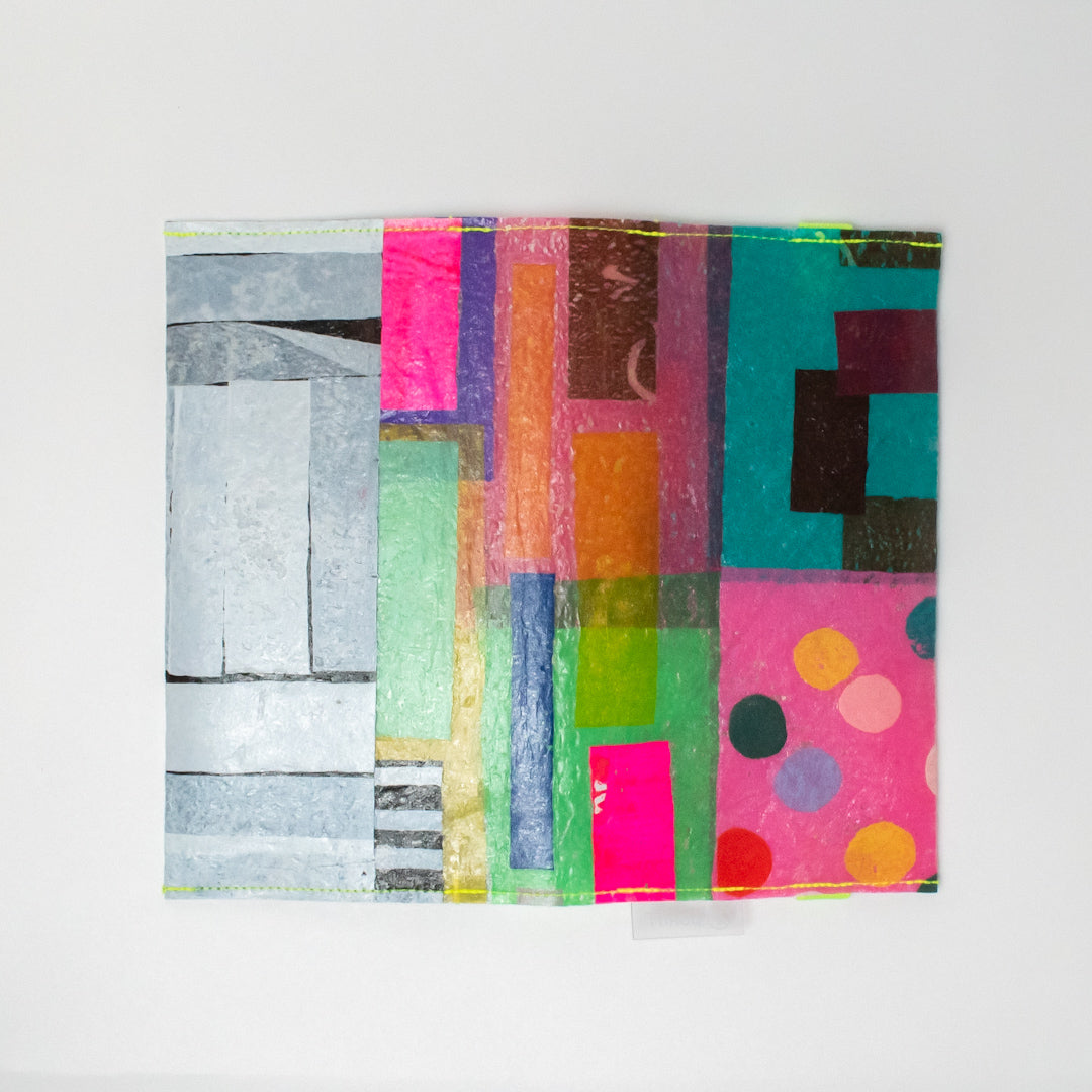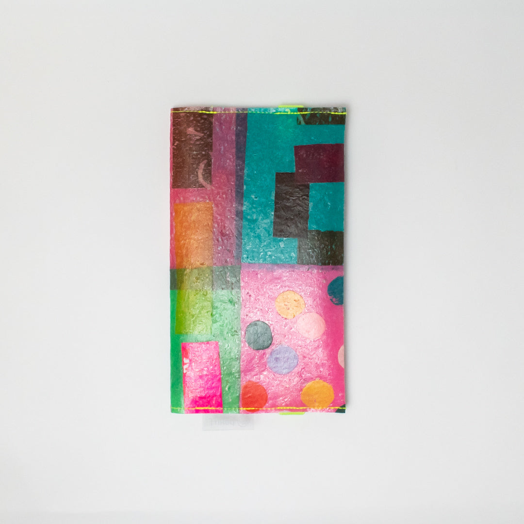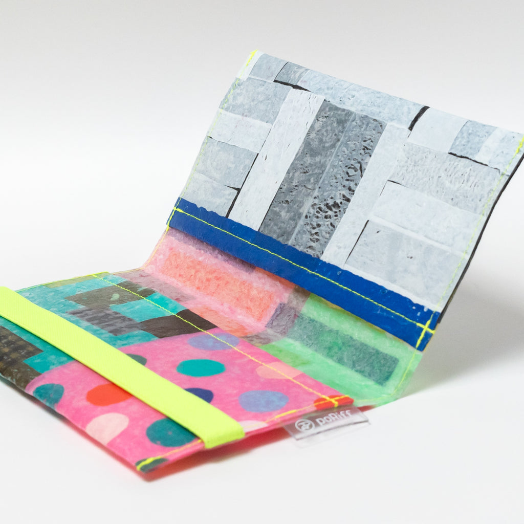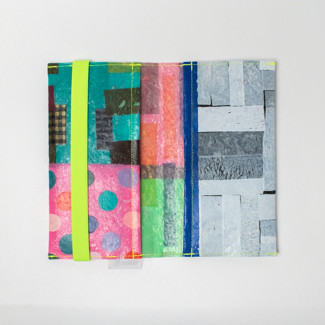 一見捨ててしまうような買い物袋たちをコラージュし、熱で圧着して完成するシートを使用してプロダクトに変えています。