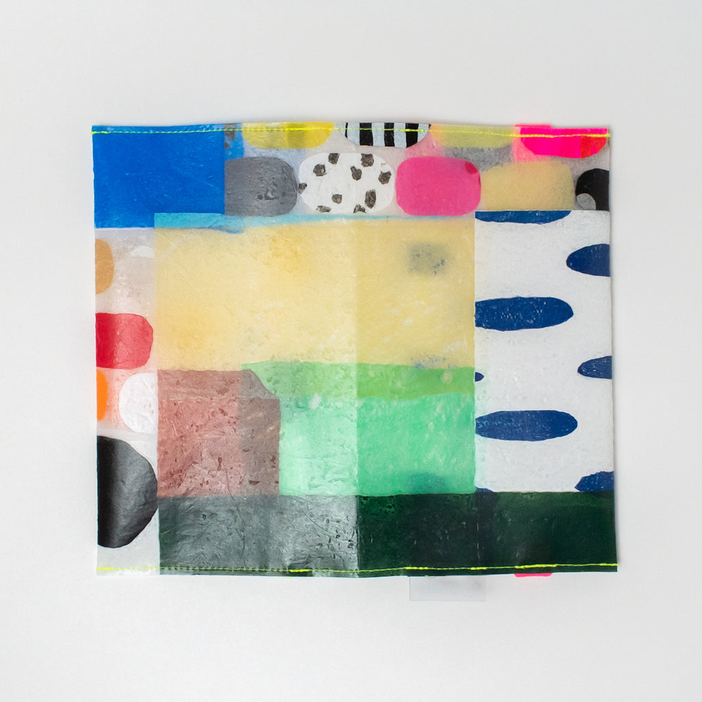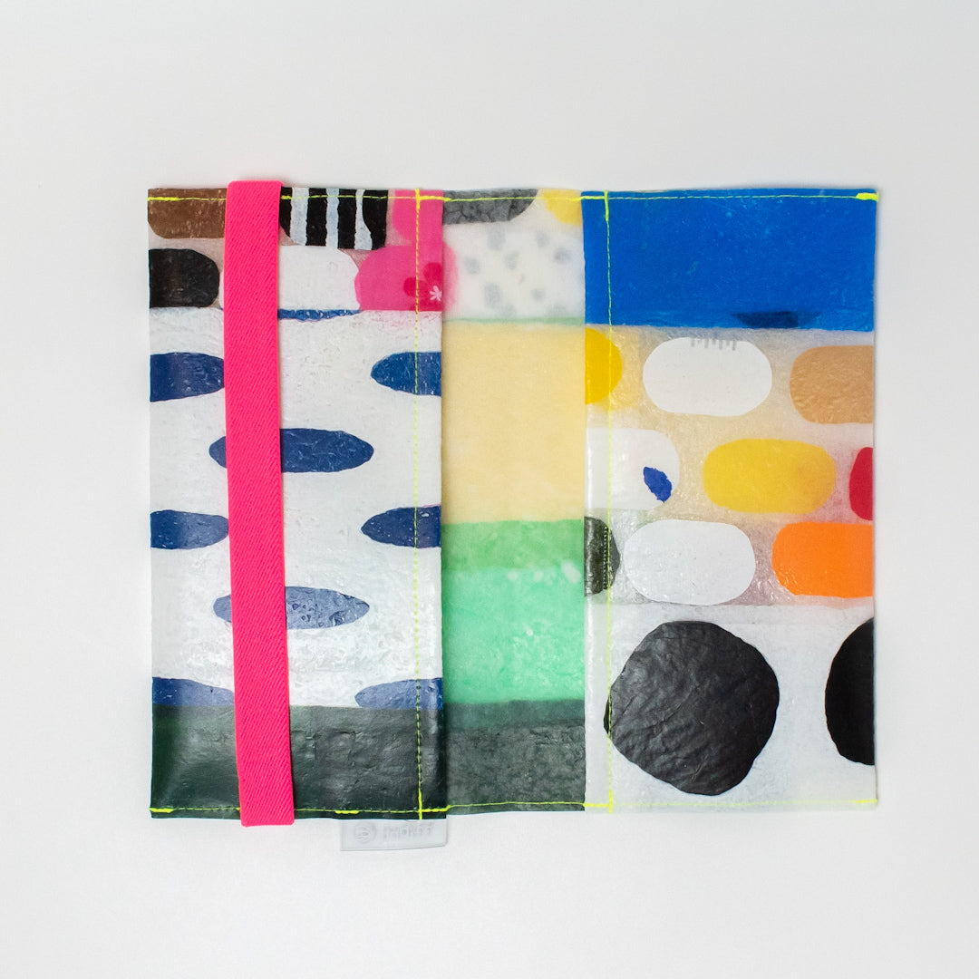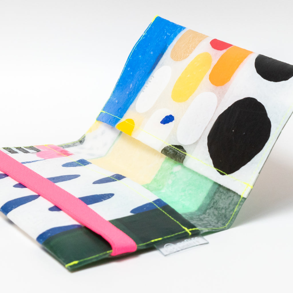 一見捨ててしまうような買い物袋たちをコラージュし、熱で圧着して完成するシートを使用してプロダクトに変えています。