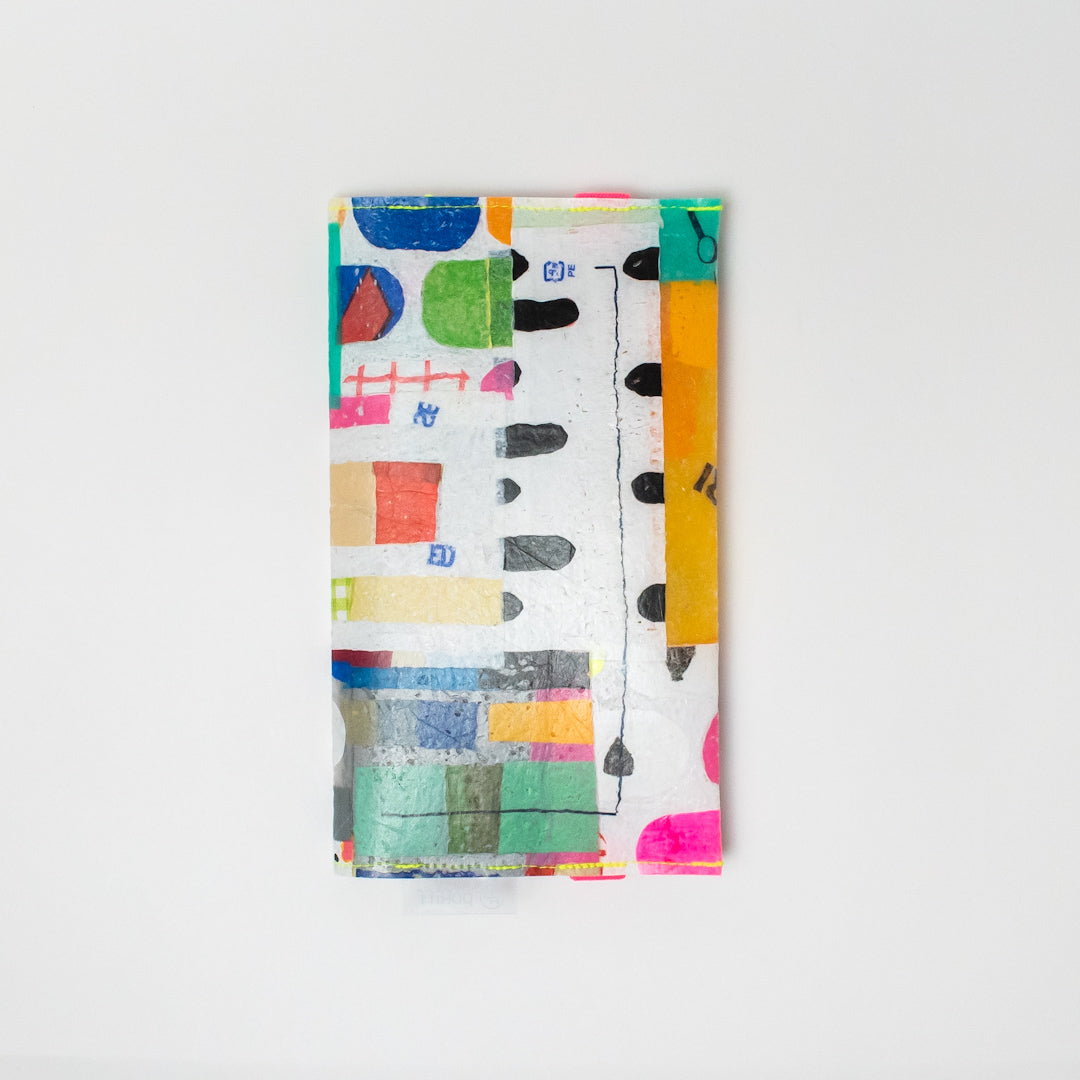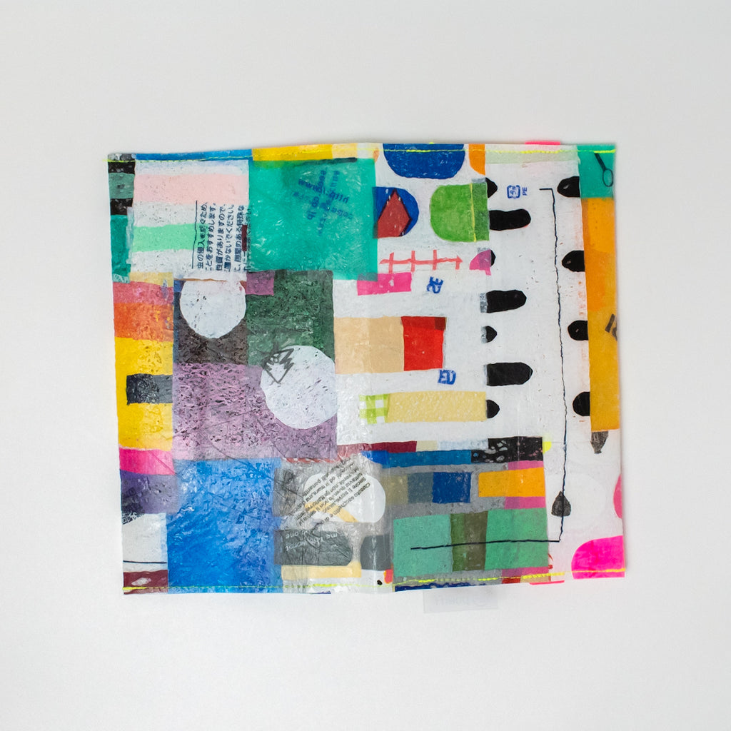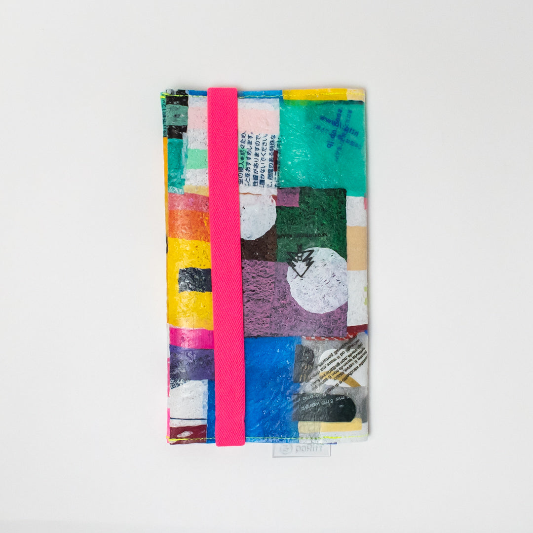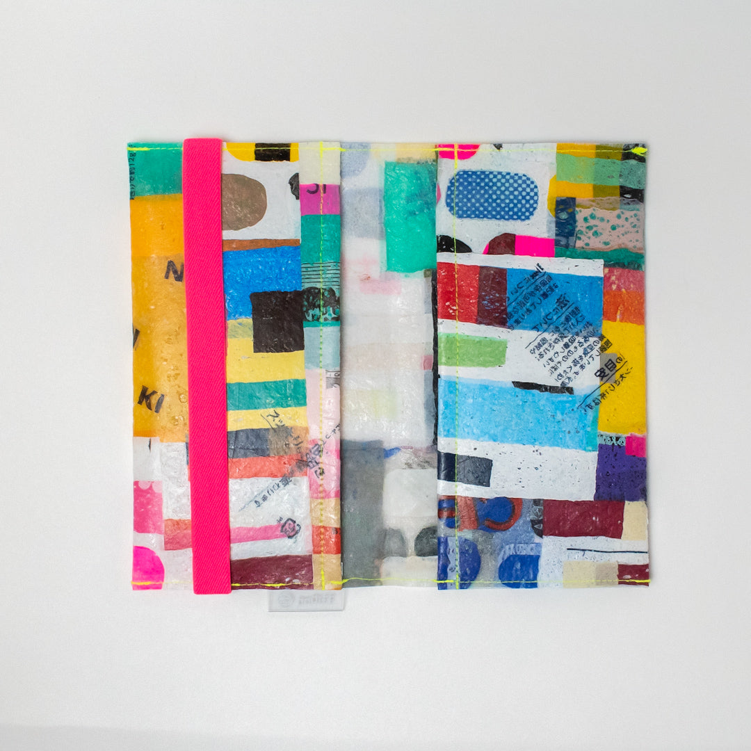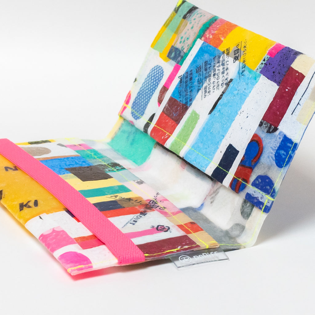 一見捨ててしまうような買い物袋たちをコラージュし、熱で圧着して完成するシートを使用してプロダクトに変えています。