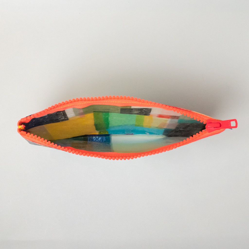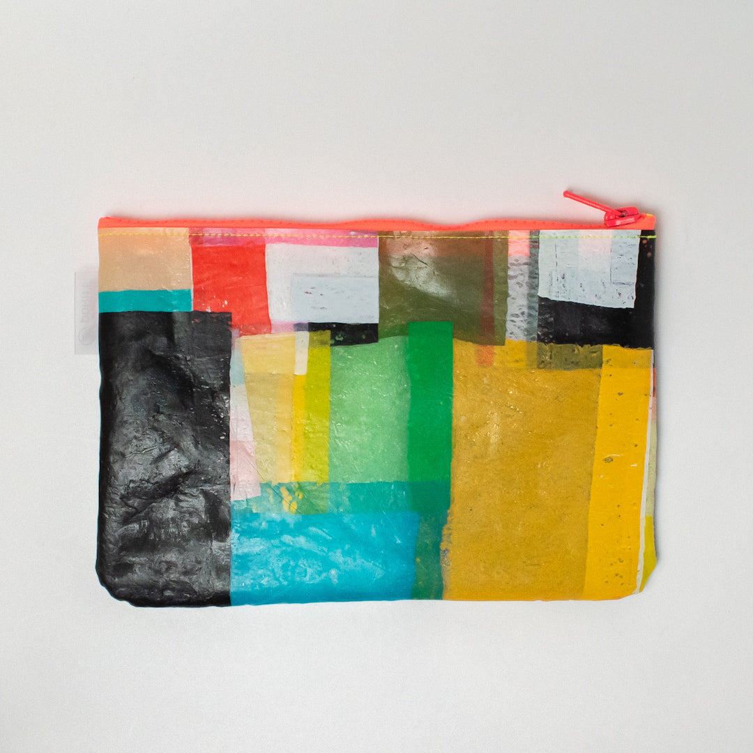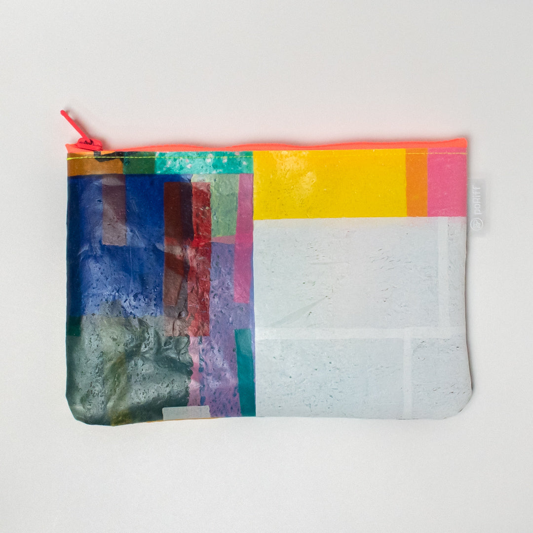 poRiffの主な材料は買い物したときにもらう買い物袋です。一見捨ててしまうような買い物袋たちをコラージュし、熱で圧着して完成するシートを使用してプロダクトに変えています。カラーはすべて買い物袋そのままの色。着色は一切していません。