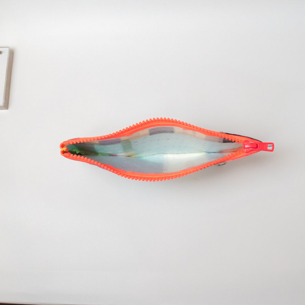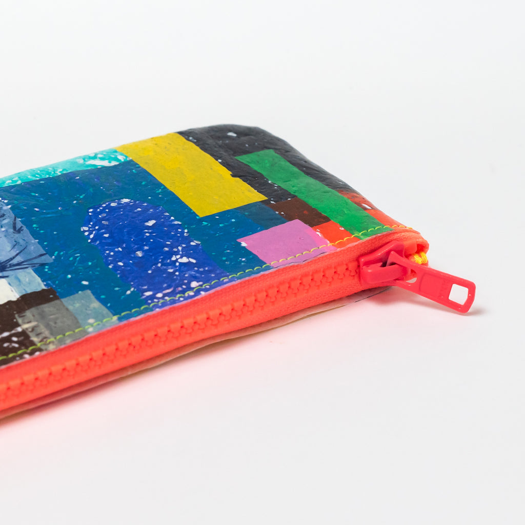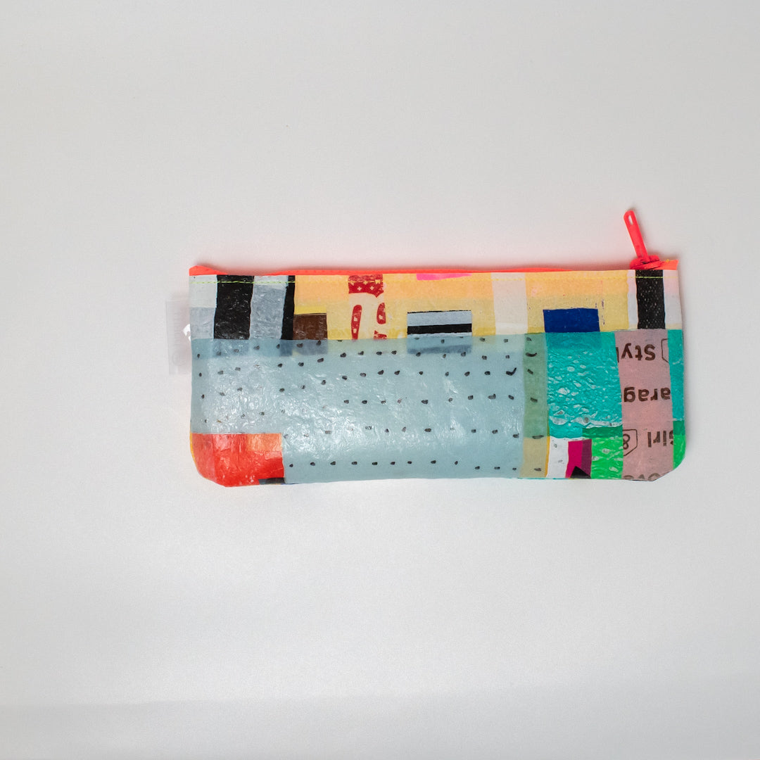 poRiffの主な材料は買い物したときにもらう買い物袋です。一見捨ててしまうような買い物袋たちをコラージュし、熱で圧着して完成するシートを使用してプロダクトに変えています。カラーはすべて買い物袋そのままの色、着色は一切していません。
