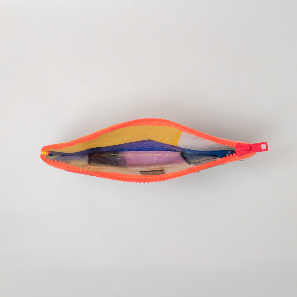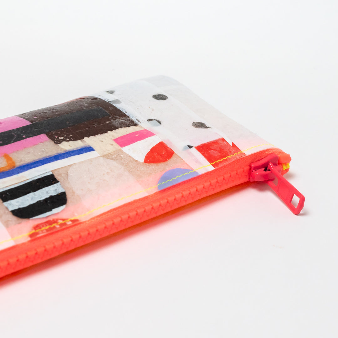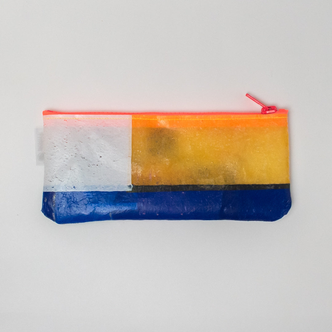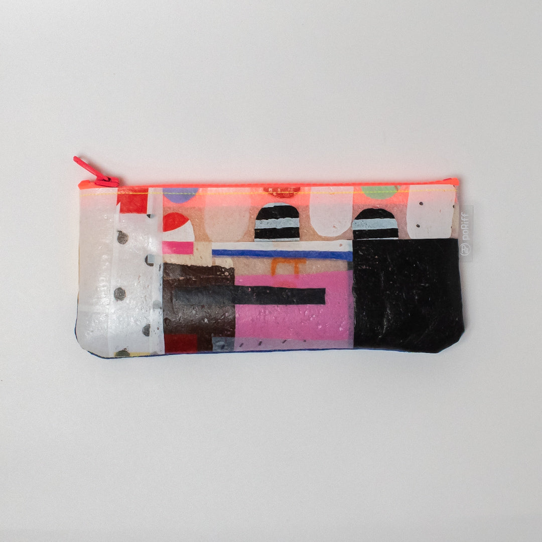poRiffの主な材料は買い物したときにもらう買い物袋です。一見捨ててしまうような買い物袋たちをコラージュし、熱で圧着して完成するシートを使用してプロダクトに変えています。カラーはすべて買い物袋そのままの色、着色は一切していません。