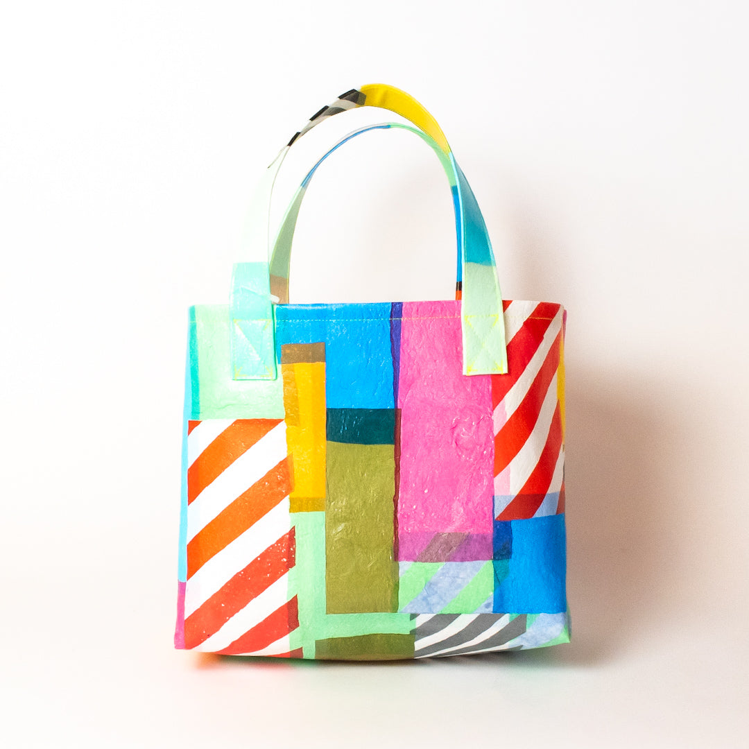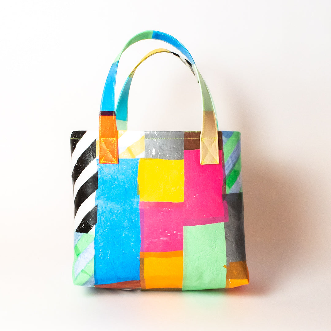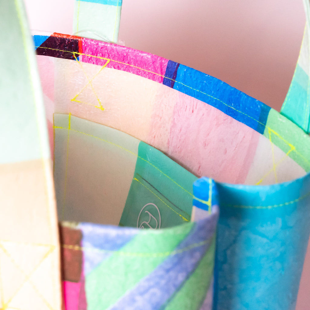 poRiffの主な材料は買い物したときにもらう買い物袋です。一見捨ててしまうような買い物袋たちをコラージュし、熱で圧着して完成するシートを使用してプロダクトに変えています。