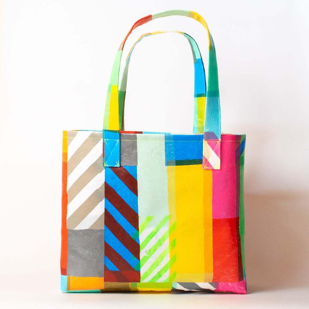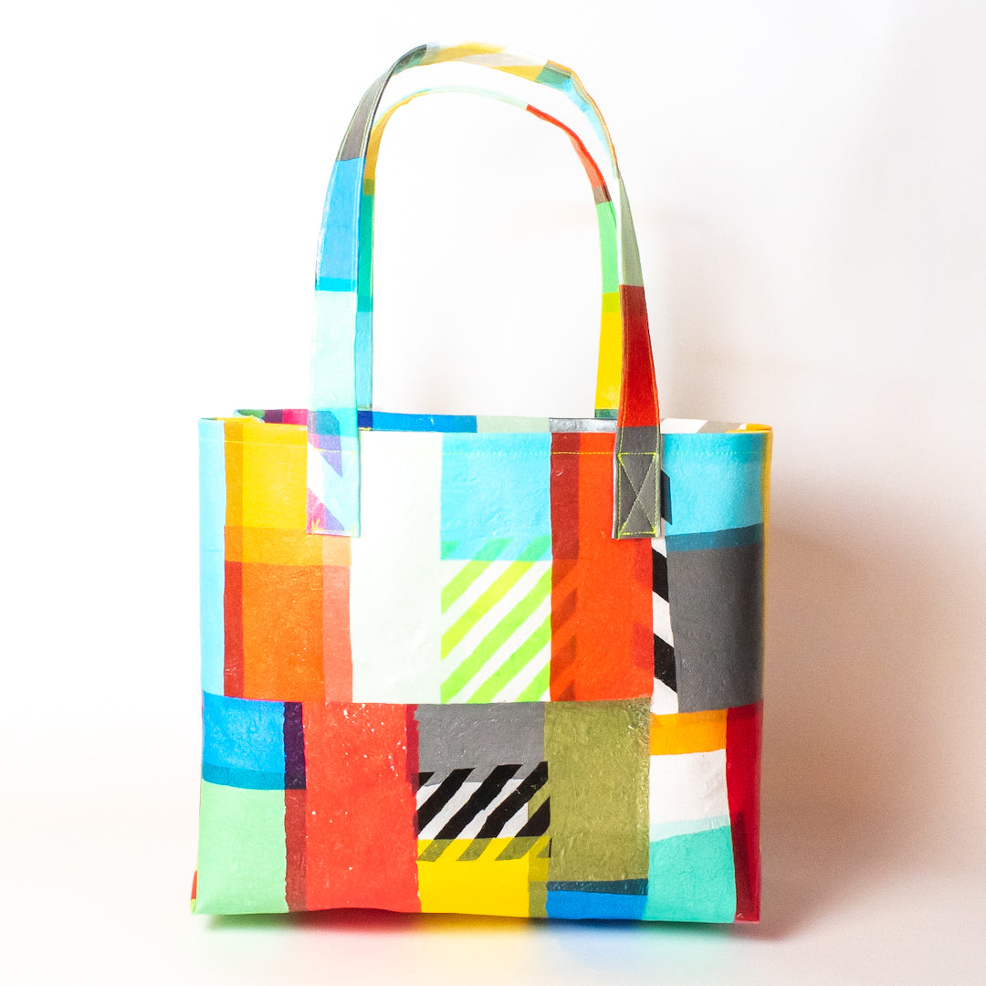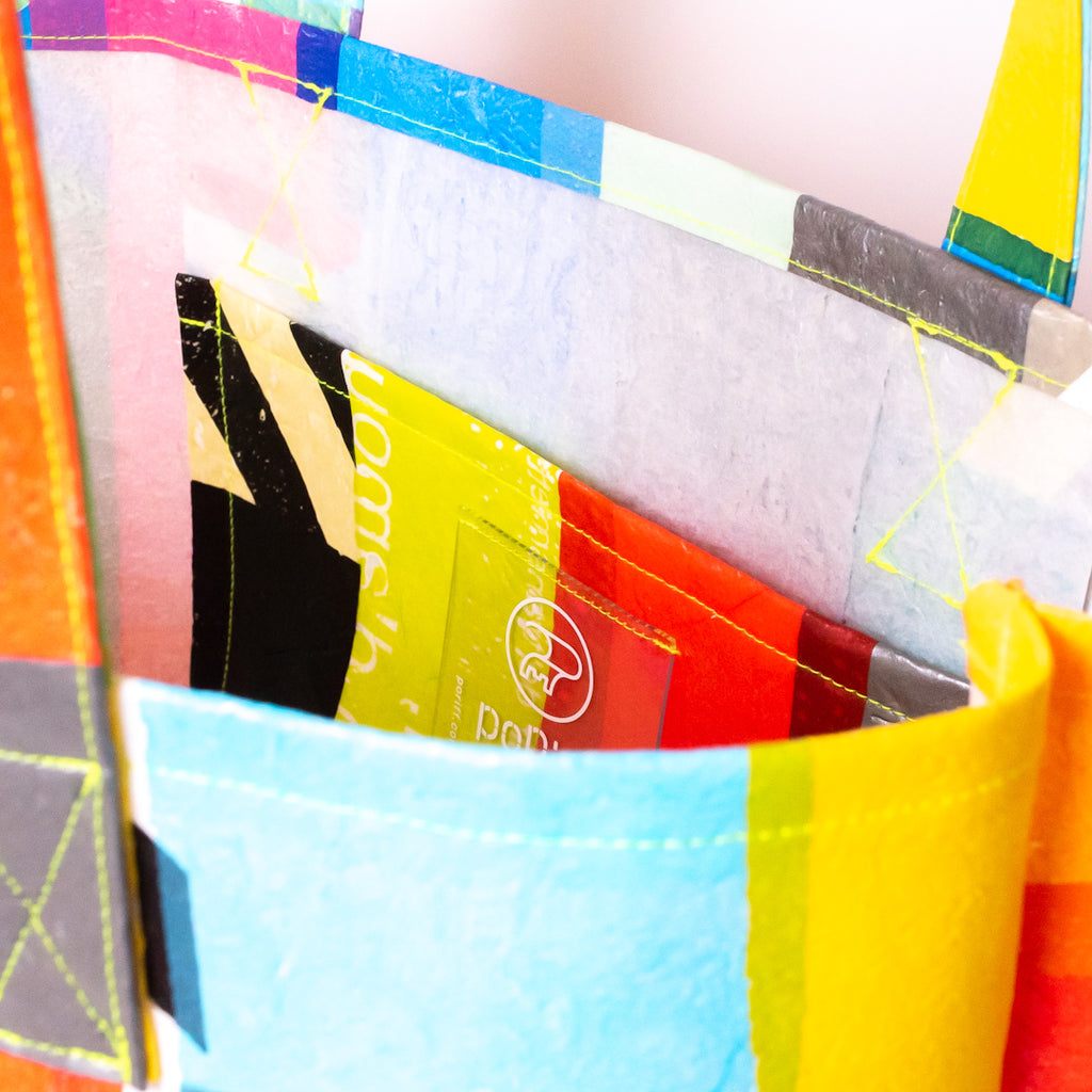 poRiffの主な材料は買い物したときにもらう買い物袋です。一見捨ててしまうような買い物袋たちをコラージュし、熱で圧着して完成するシートを使用してプロダクトに変えています。