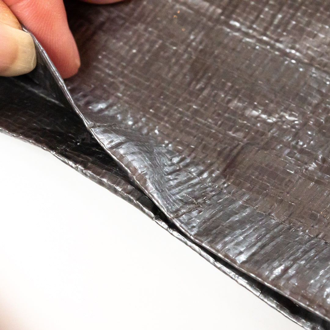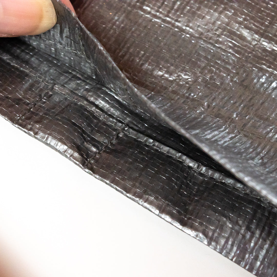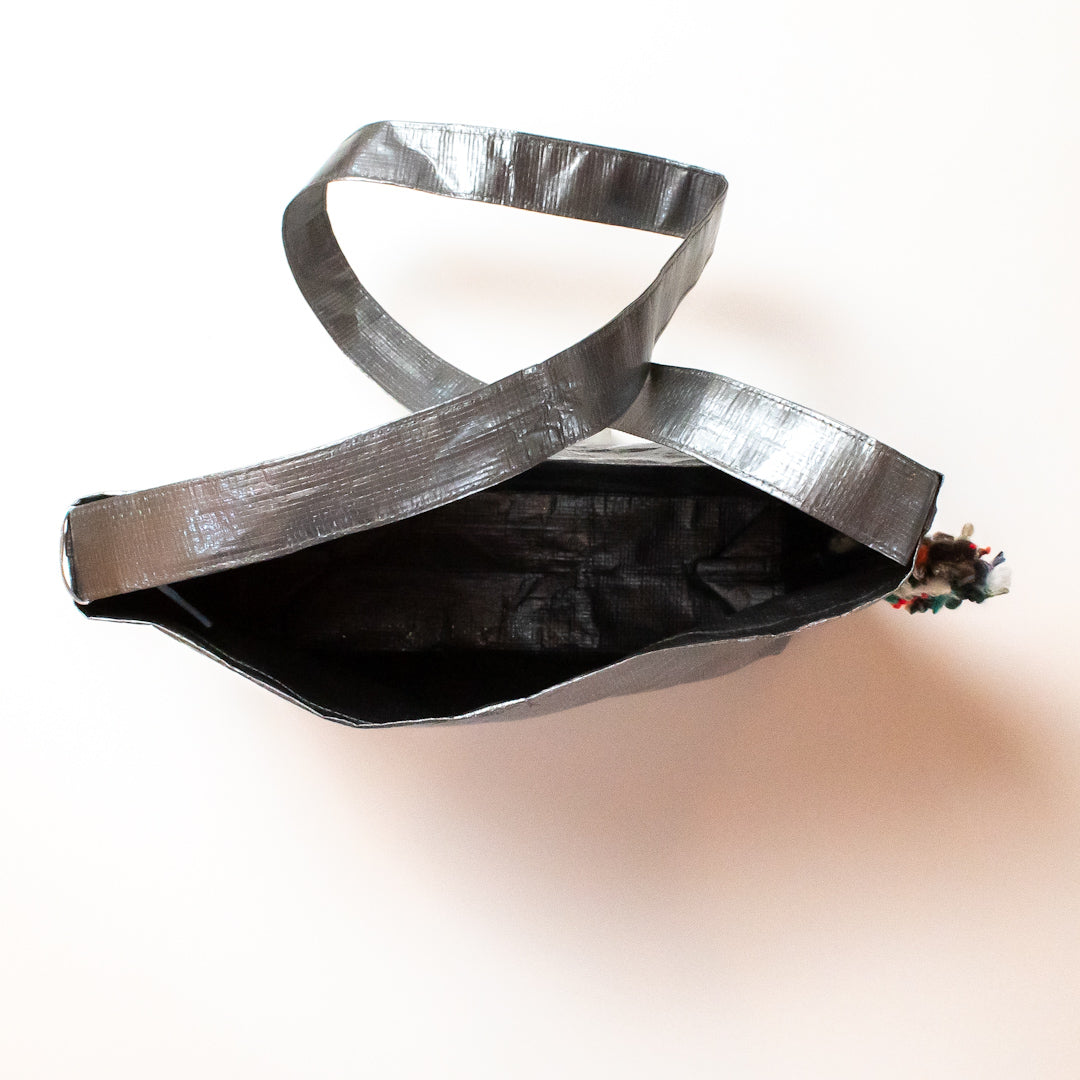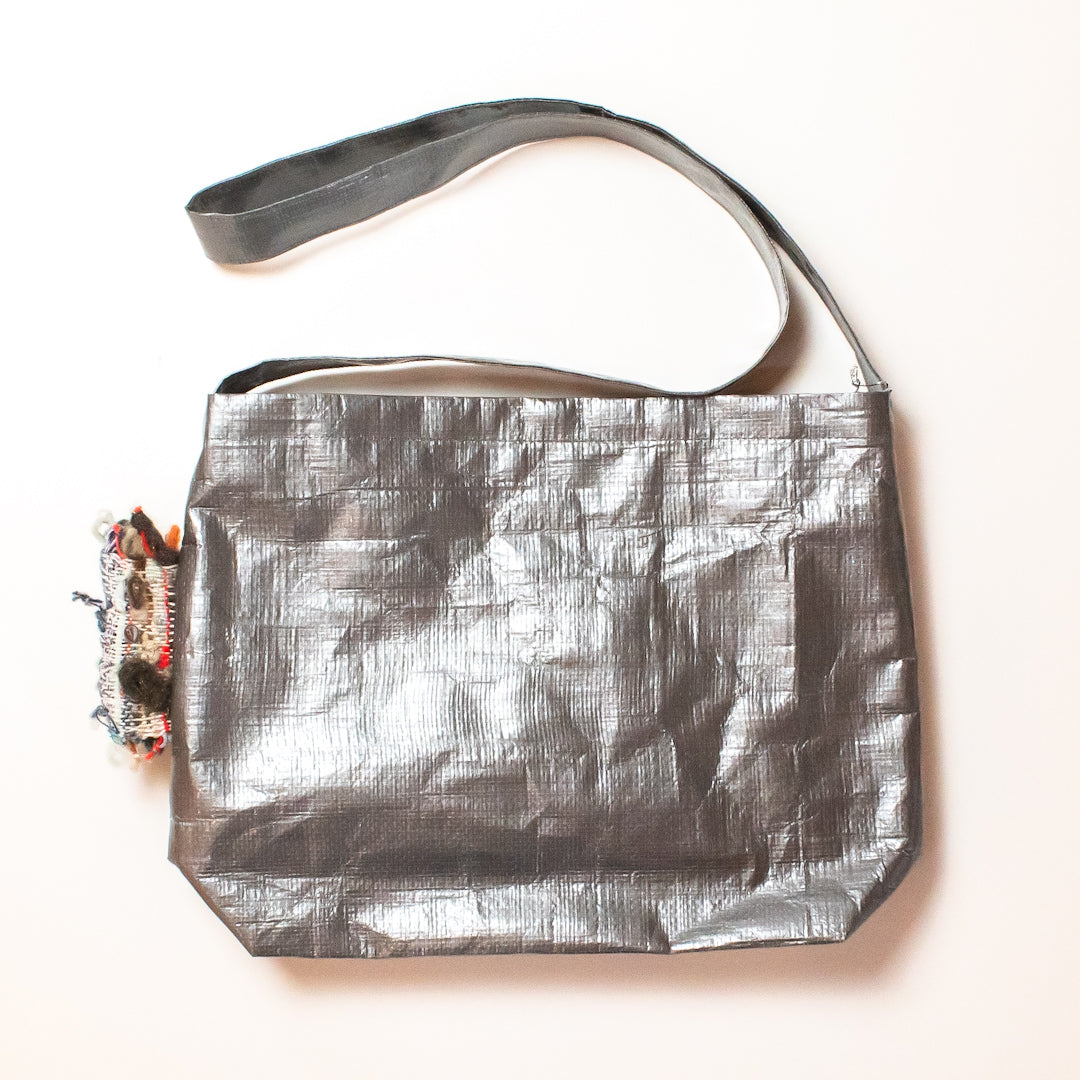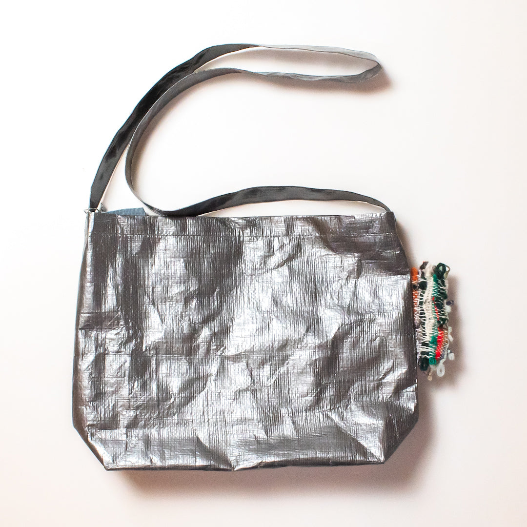 織物のタグがアクセントのシルバーのサコッシュです。口がマグネットで封が出来ます。