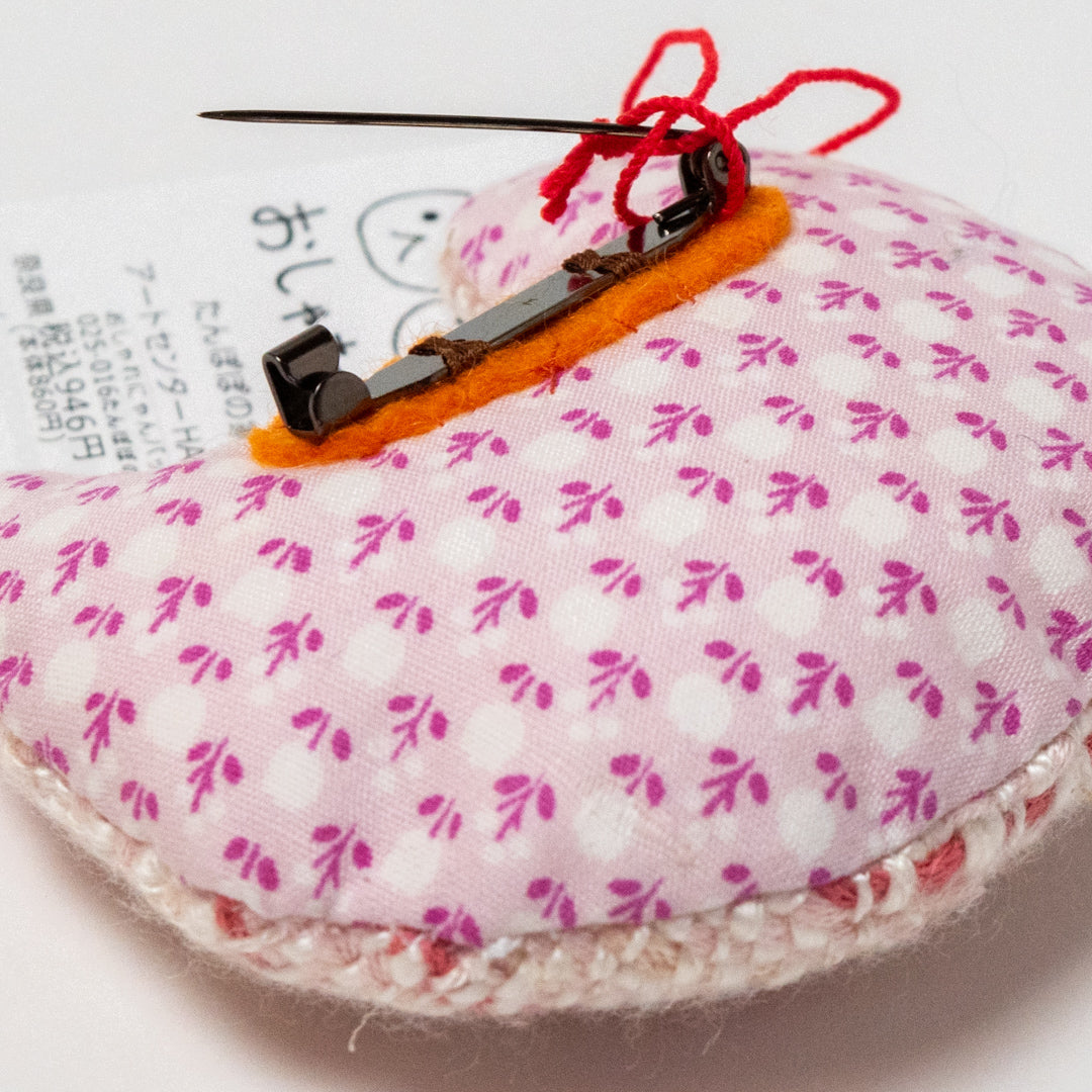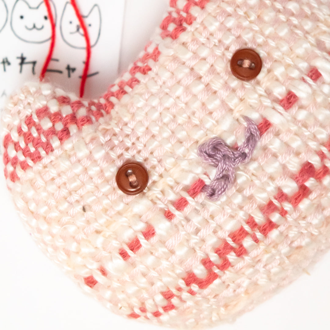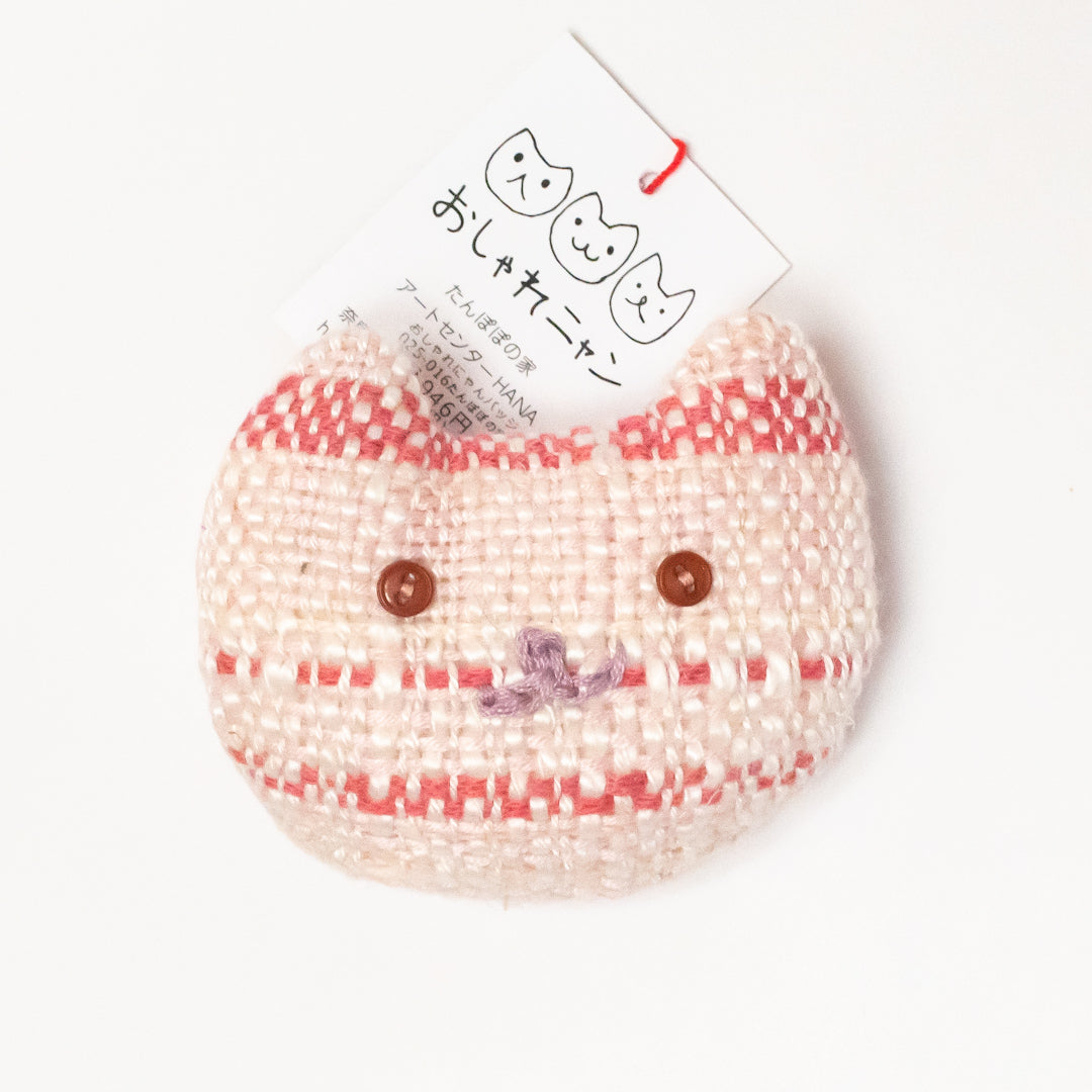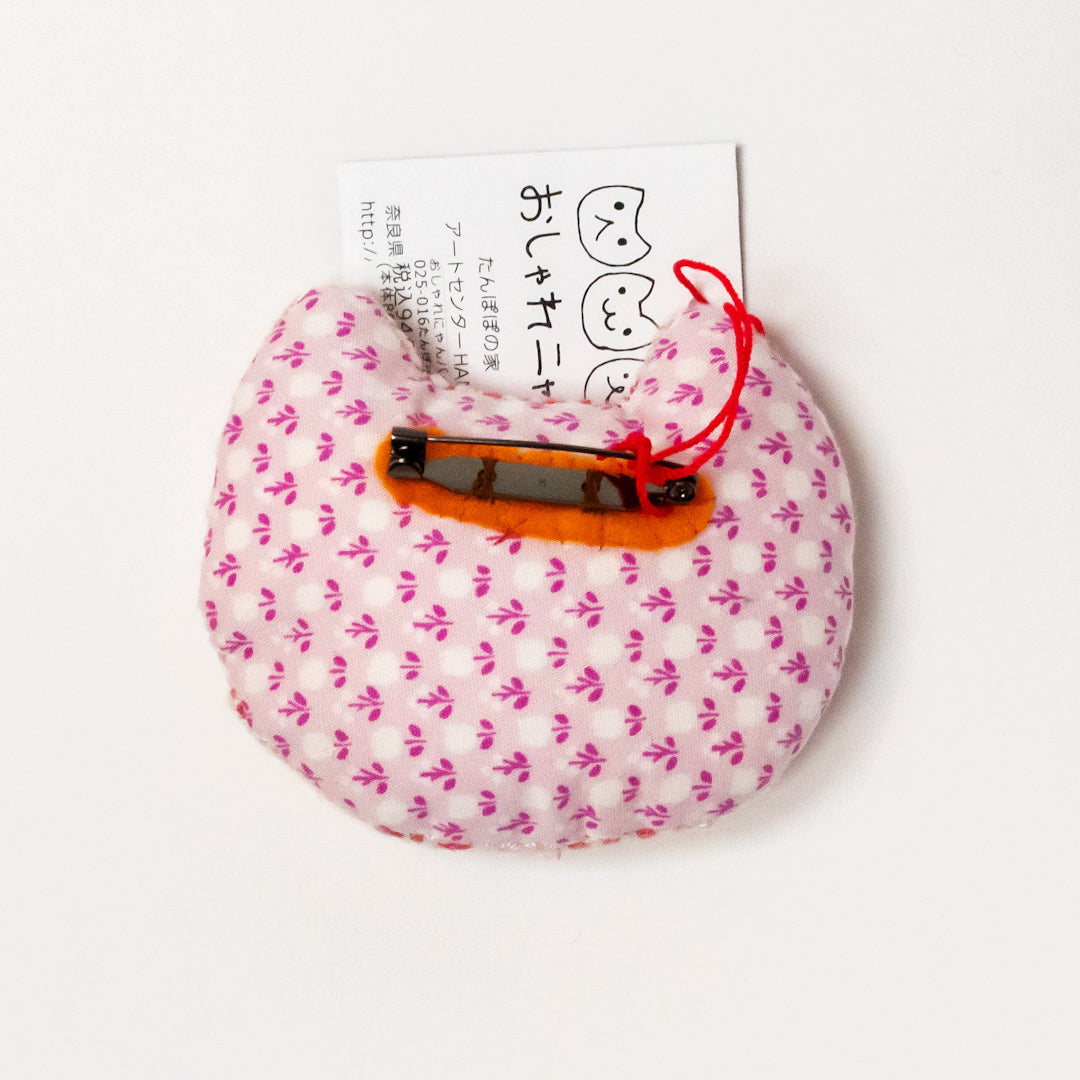 ネコちゃんのお顔のバッジです。布と糸生地のバッジなので柔らかく、手作り感が感じられます。