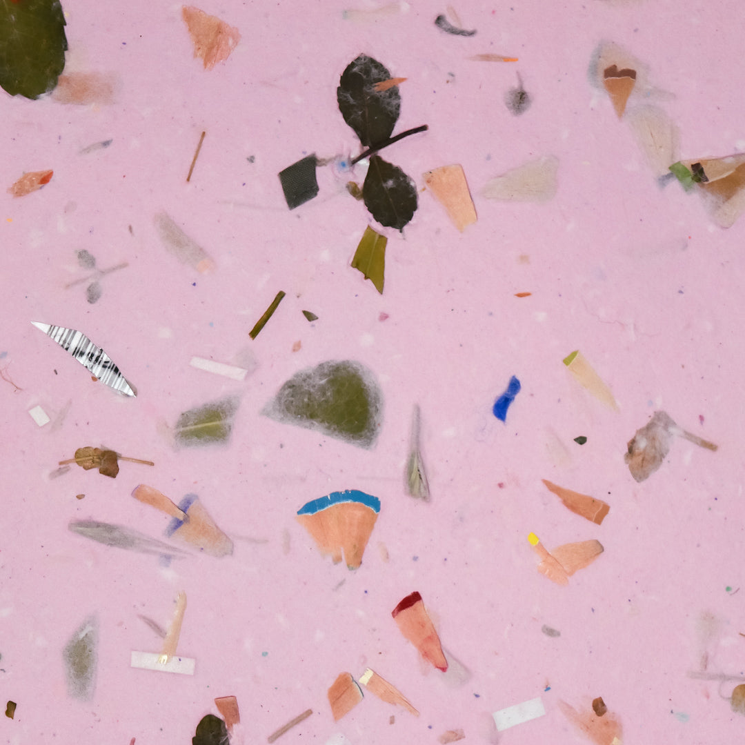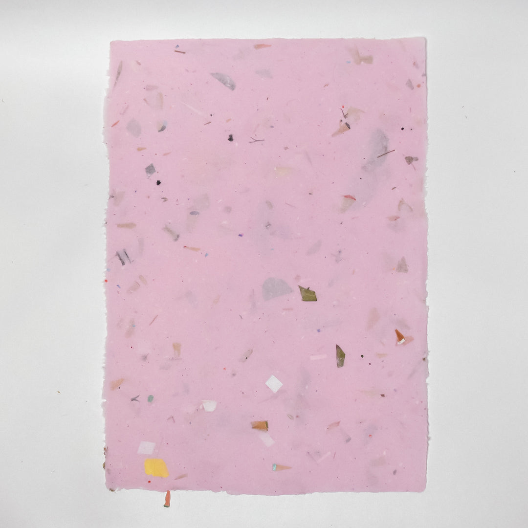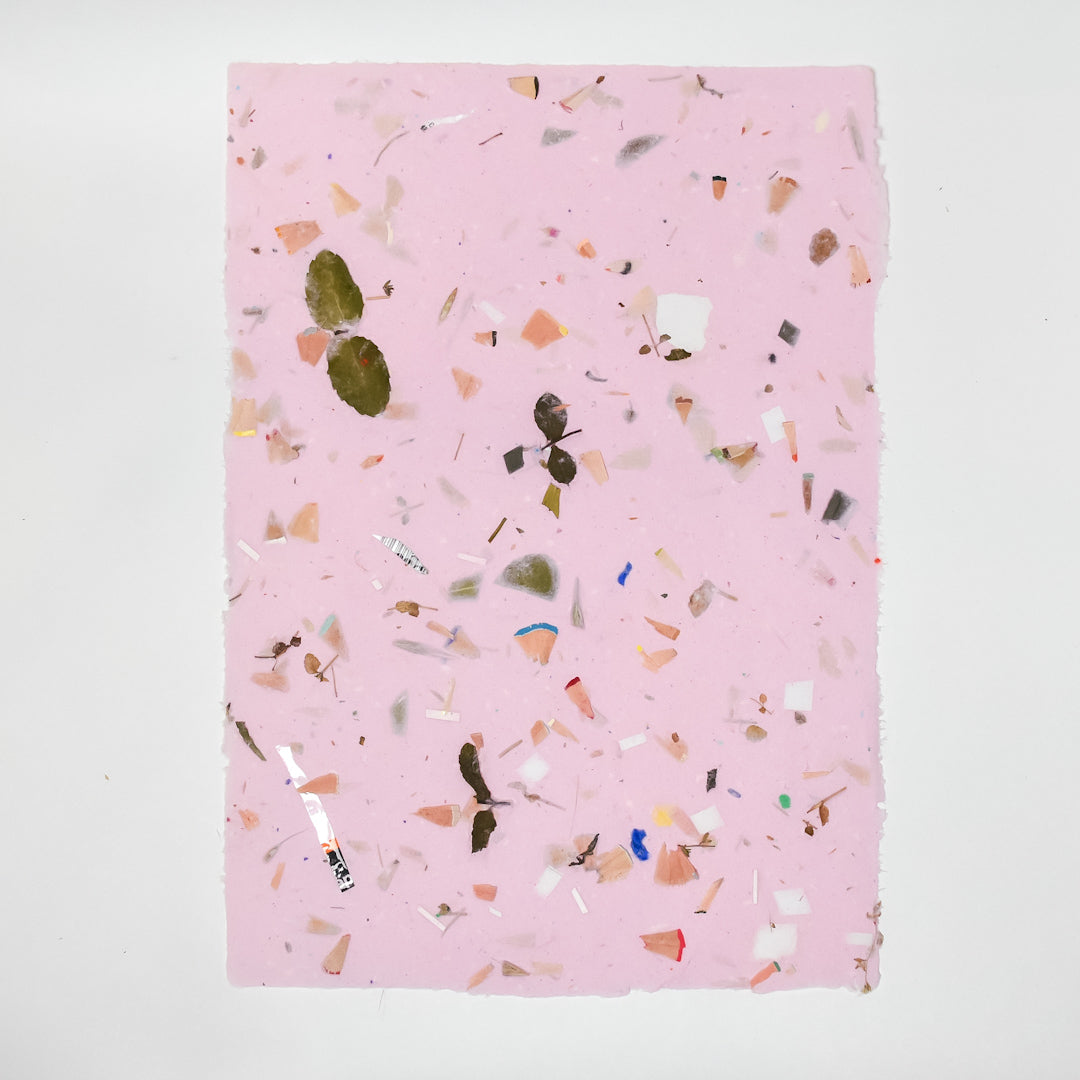 しのぶさんが作るオリジナル紙漉き製品です。草の葉や種、鉛筆削りで出たカラフルなやつ、包装紙の切れ端...季節や気分のネタを入れて、自由に製作しています。