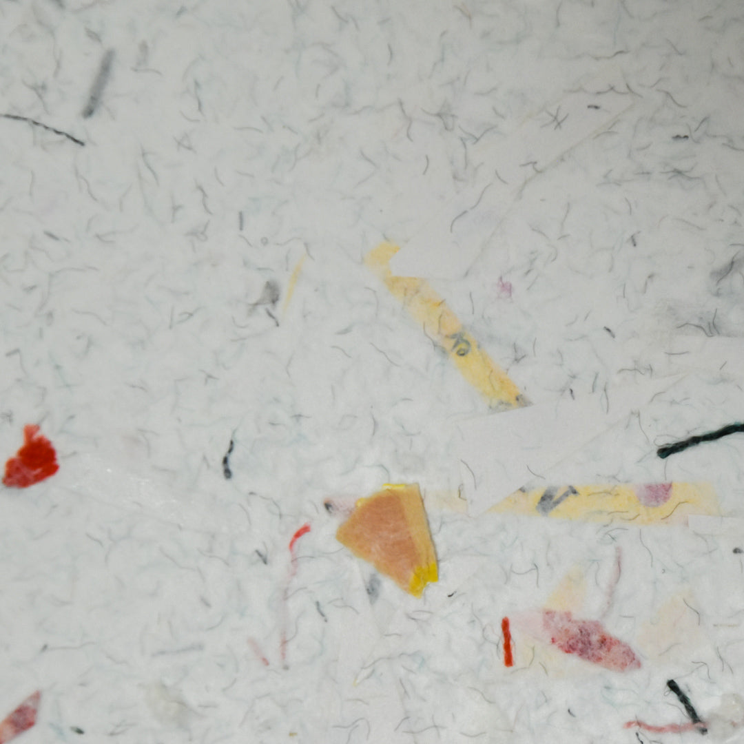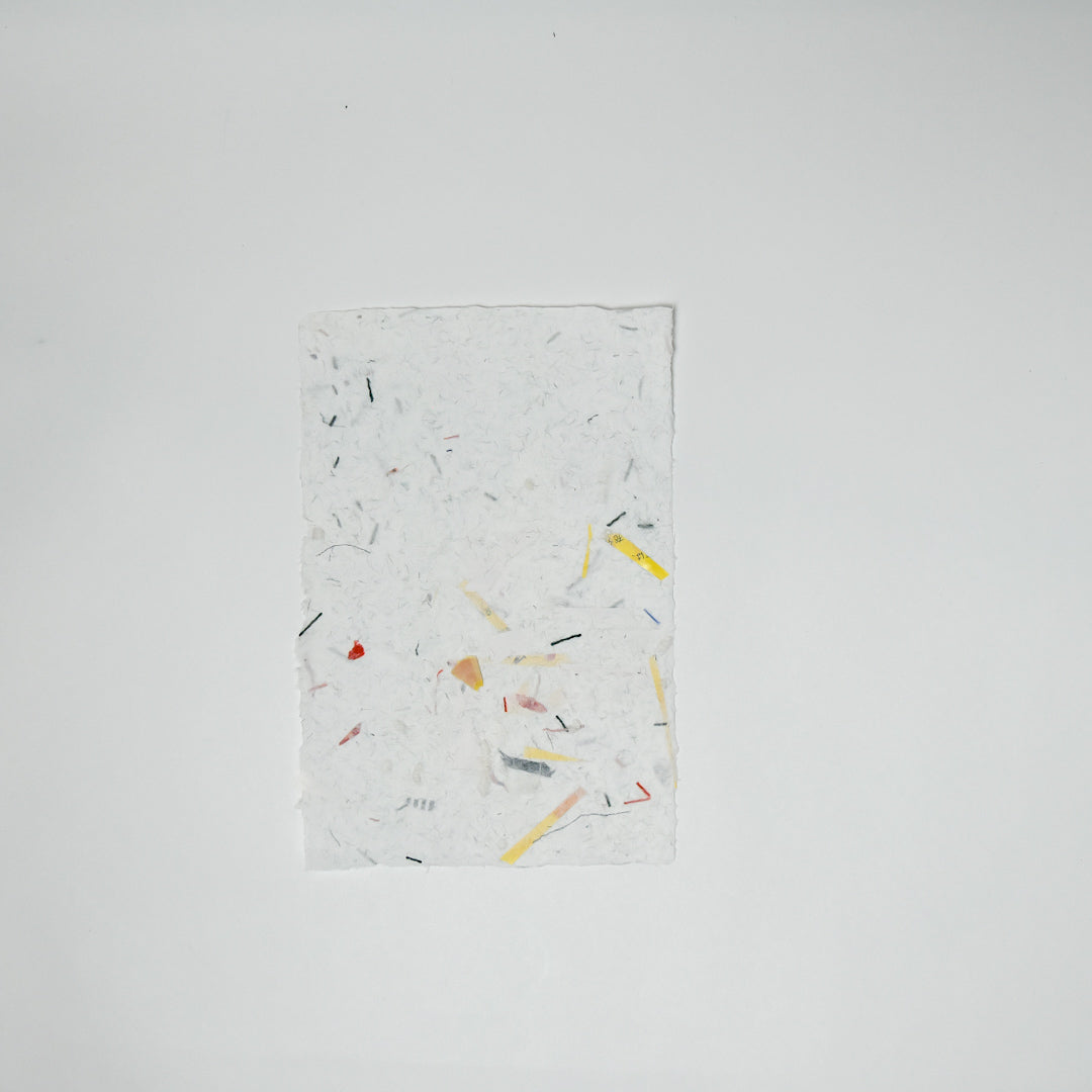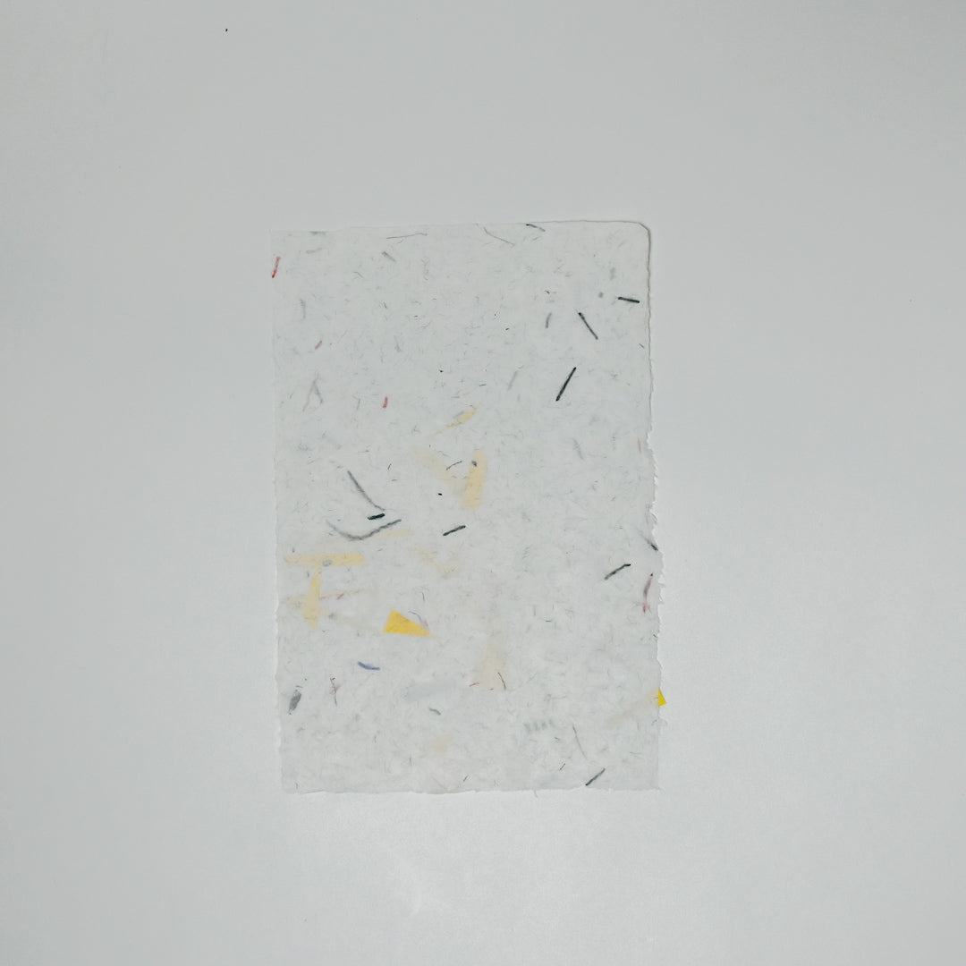 しのぶさんが作るオリジナル紙漉き製品です。草の葉や種、鉛筆削りで出たカラフルなやつ、包装紙の切れ端...季節や気分のネタを入れて、自由に製作しています。