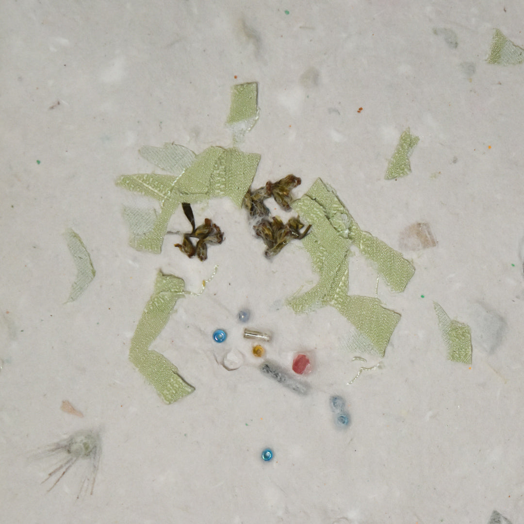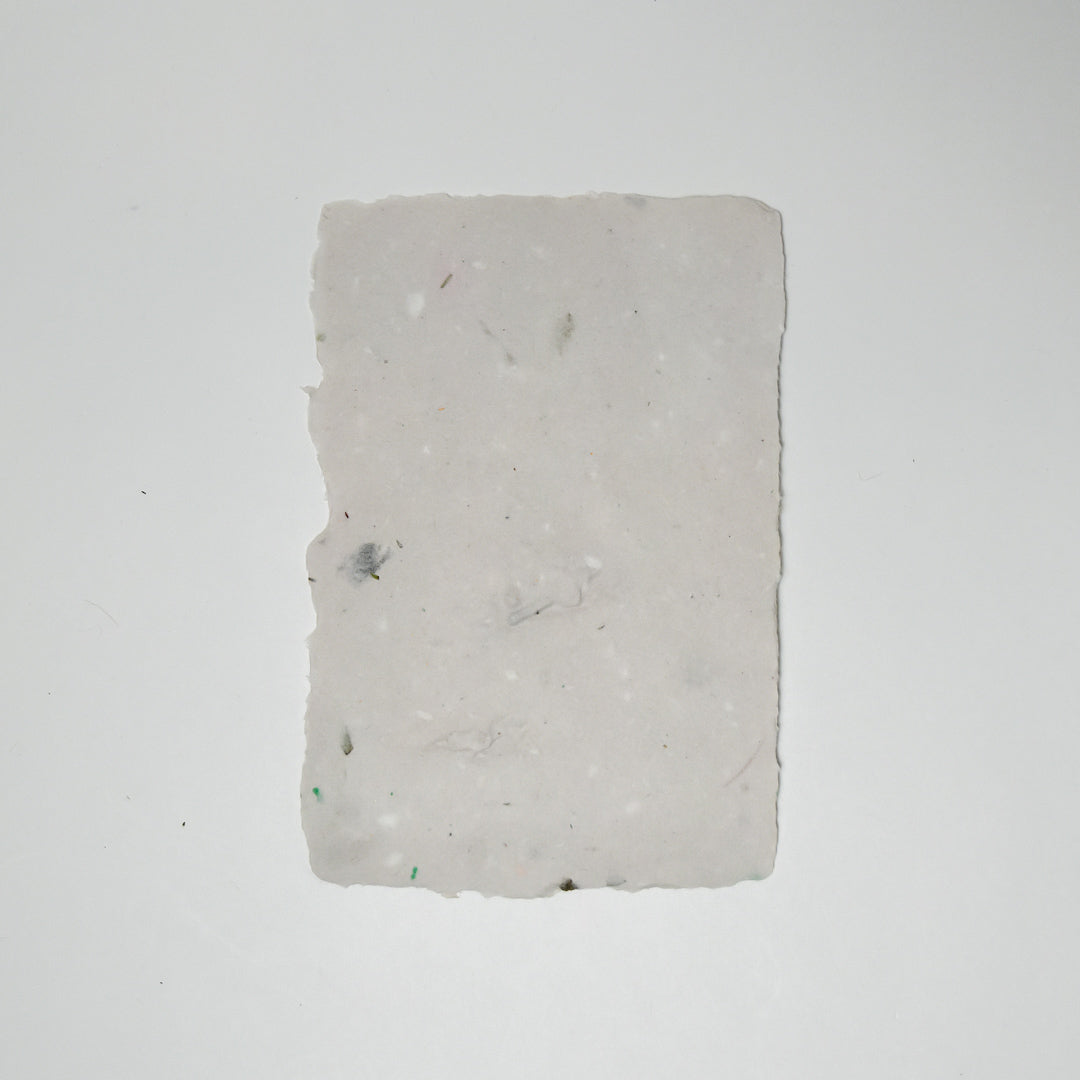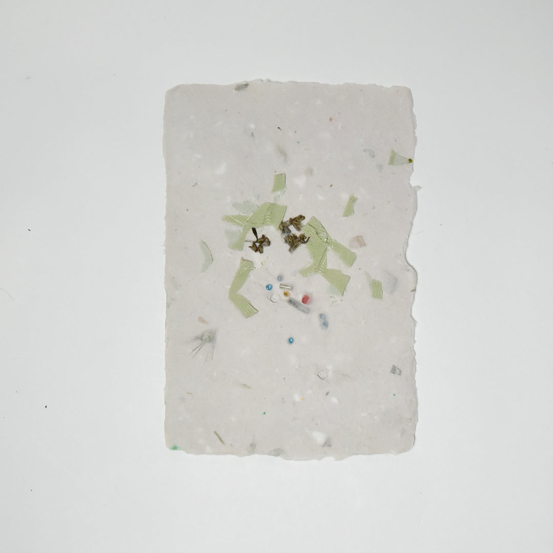 しのぶさんが作るオリジナル紙漉き製品です。草の葉や種、鉛筆削りで出たカラフルなやつ、包装紙の切れ端...季節や気分のネタを入れて、自由に製作しています。