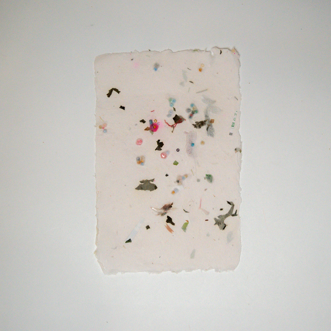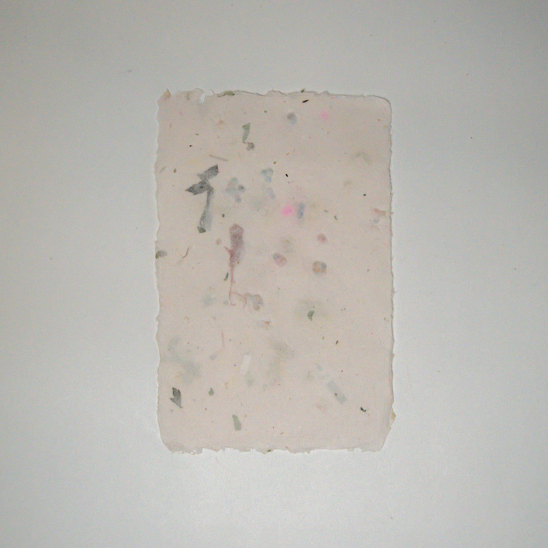しのぶさんが作るオリジナル紙漉き製品です。草の葉や種、鉛筆削りで出たカラフルなやつ、包装紙の切れ端...季節や気分のネタを入れて、自由に製作しています。