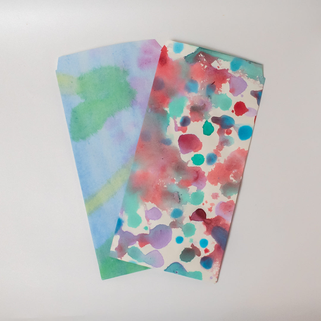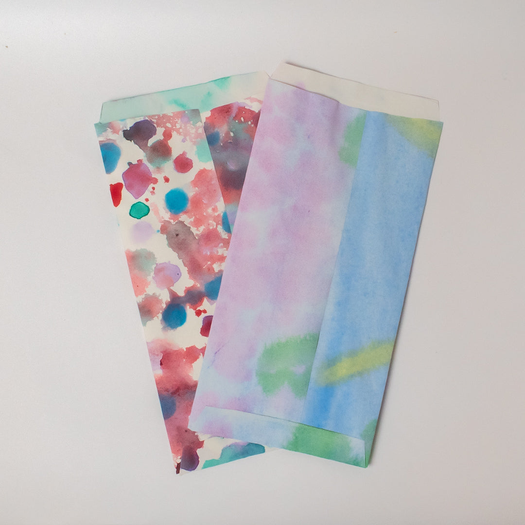 障子紙に水彩でにじみ絵を描いた色鮮やかな素材をろうびきした