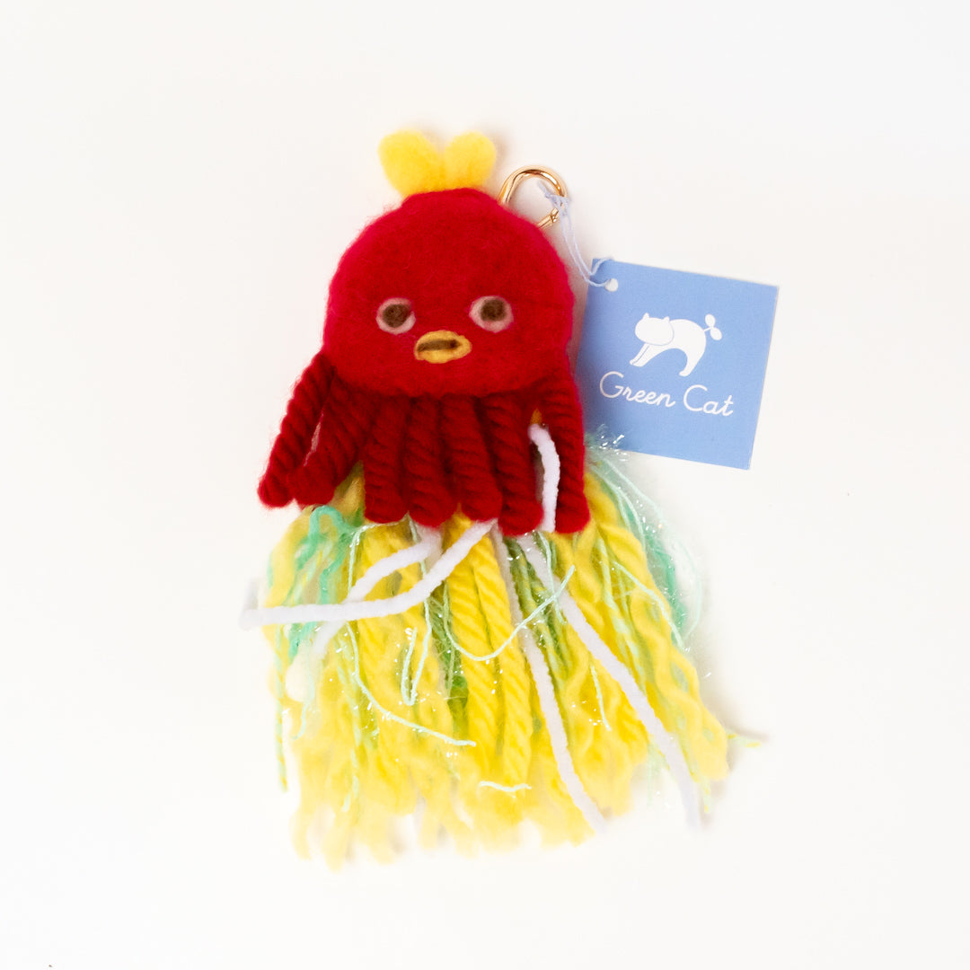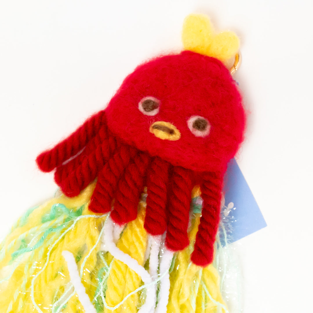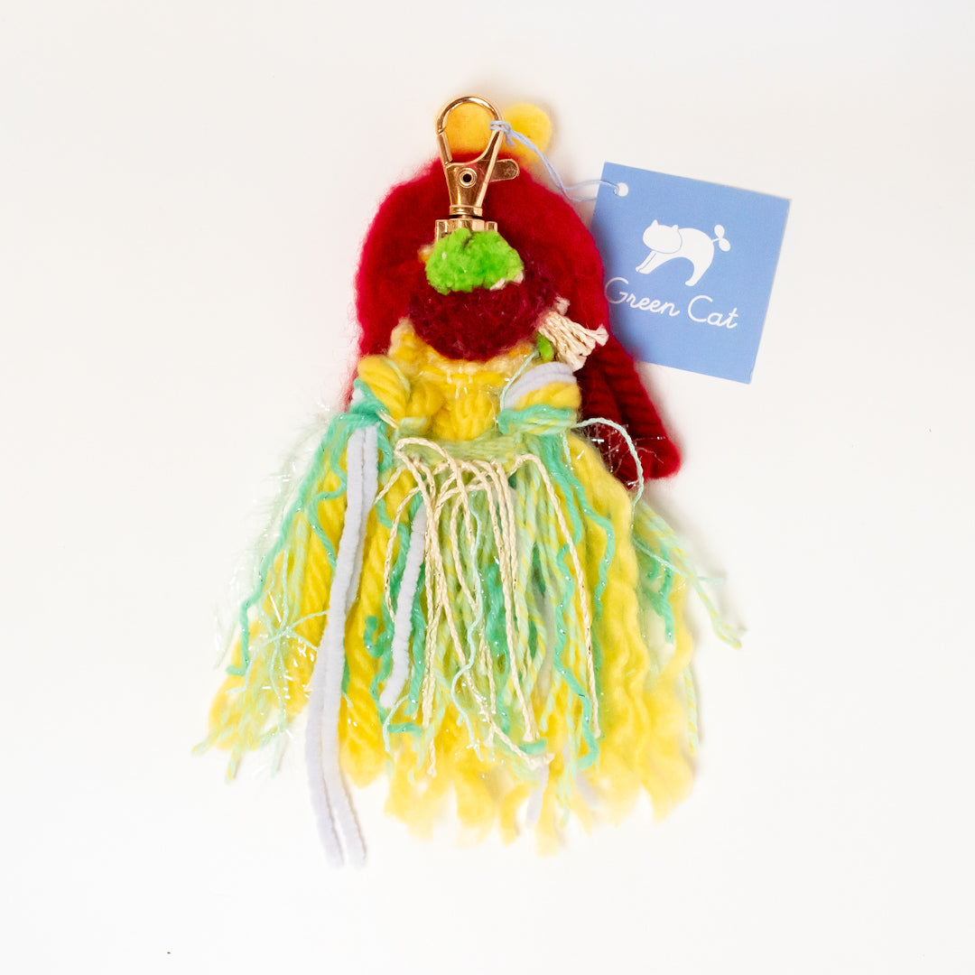 ユニークなキャラクターのキーホルダーを、ウィービングと羊毛で製作しました。メンバーのMOCOLINさんが自由な発想で製作した商品です。