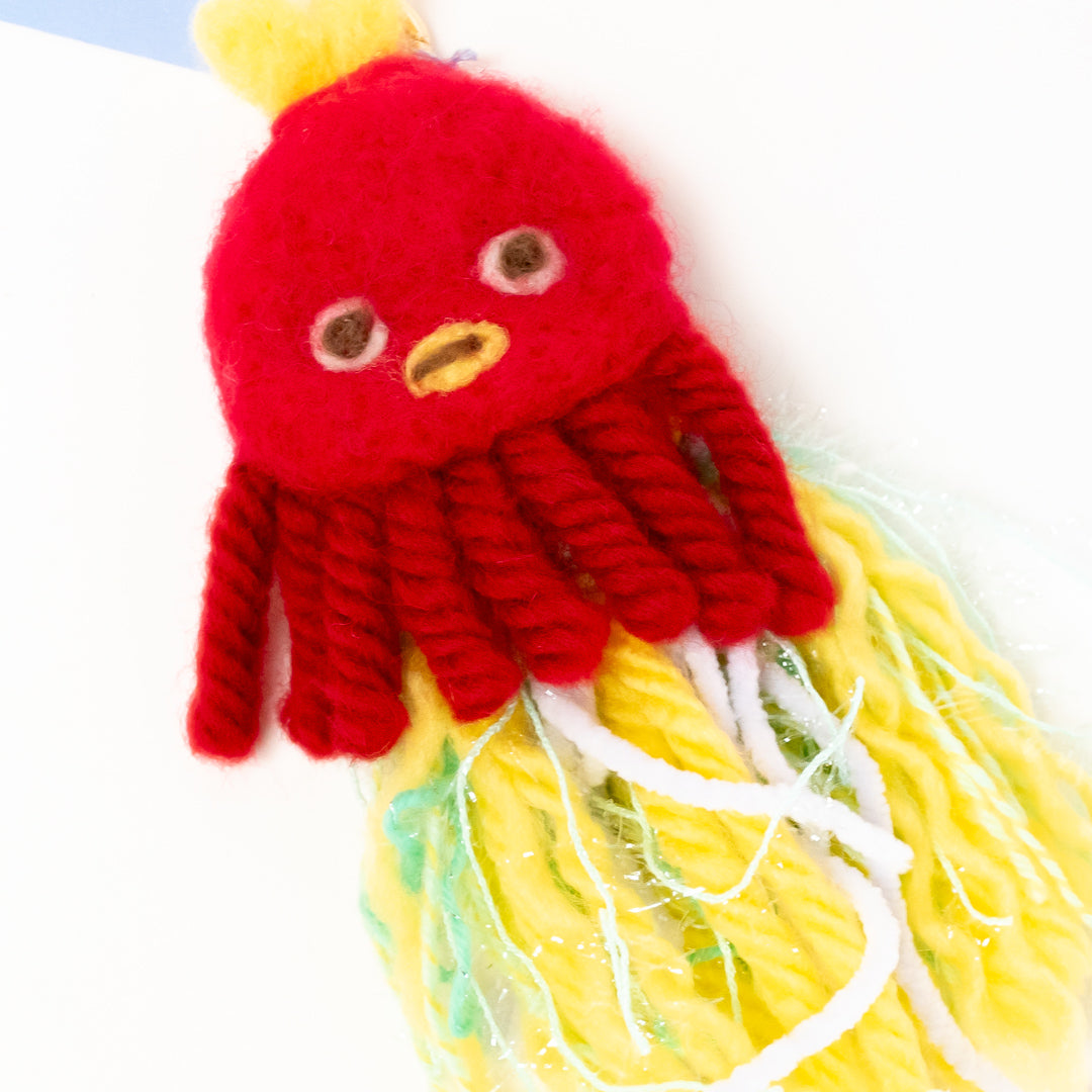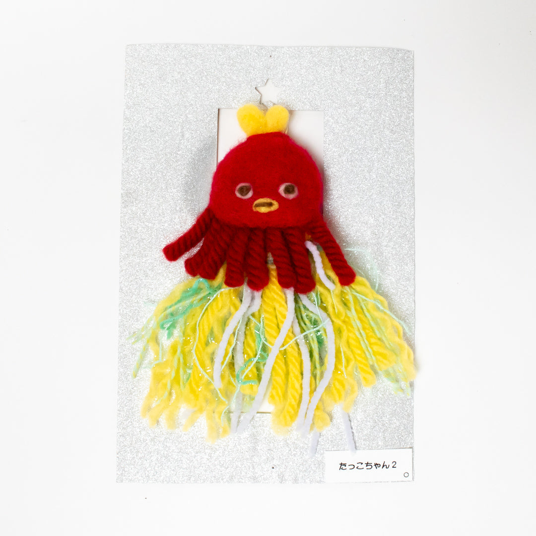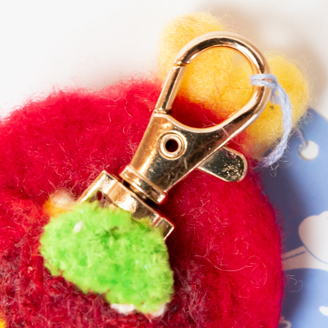 ユニークなキャラクターのキーホルダーを、ウィービングと羊毛で製作しました。メンバーのMOCOLINさんが自由な発想で製作した商品です。