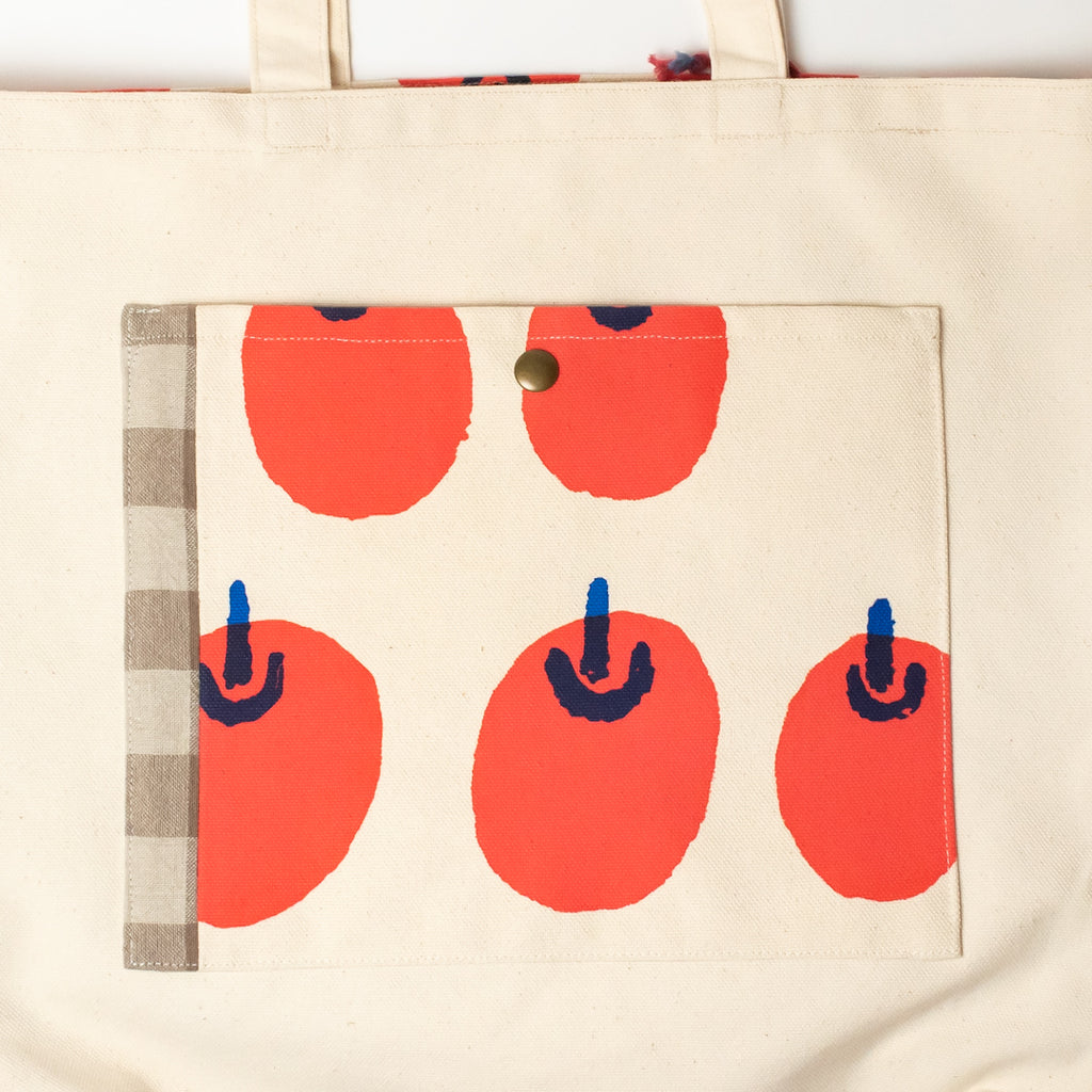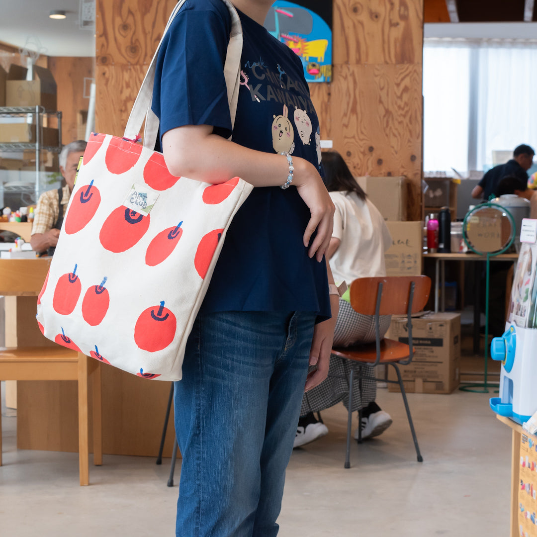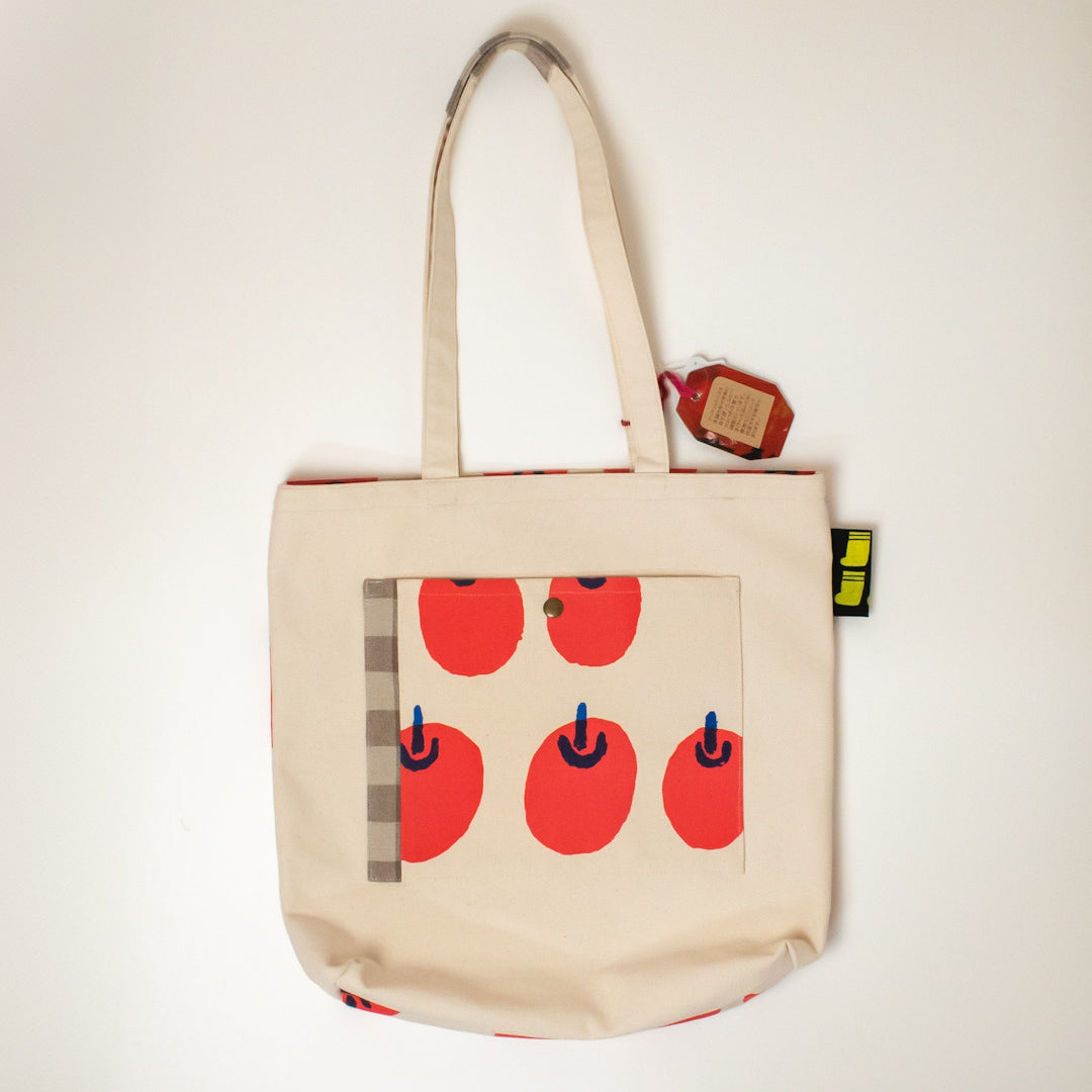 幌布を使用し、キュートなりんご柄をプリントした丈夫で大きめのトートバックです。大きなポケッット付きなのたくさんの物が入ります。