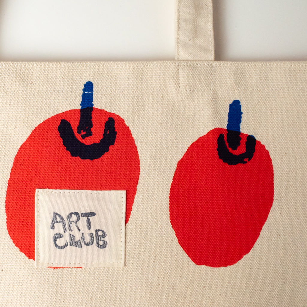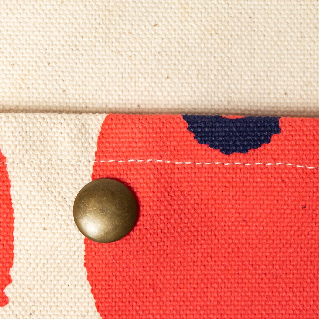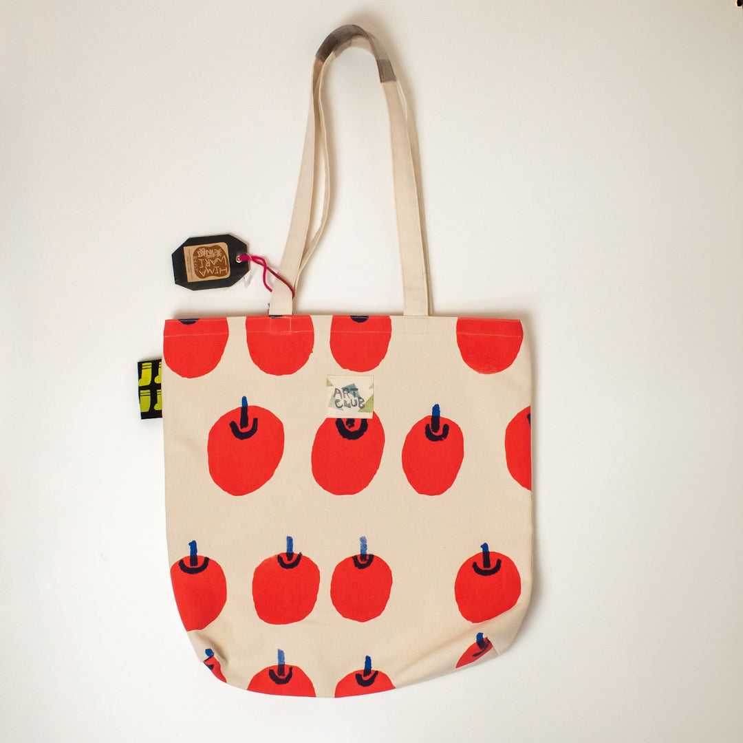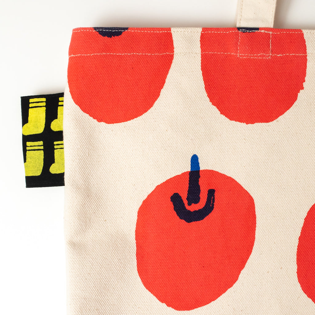 幌布を使用し、キュートなりんご柄をプリントした丈夫で大きめのトートバックです。大きなポケッット付きなのたくさんの物が入ります。